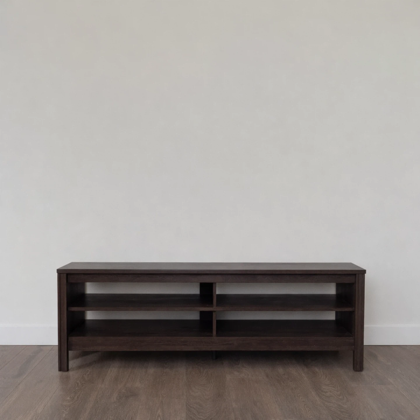 This is a dark brown media console/ stand with three open shelves. It's made of wood. This console is suitable for housing electronics like TVs and gaming consoles.