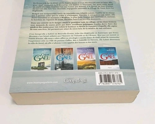 Cœur de Gaël – Tome 1 : La Vallée des larmes is the first volume of Sonia Marmen's popular historical saga. Set in Scotland in the late 17th century, this novel blends romance, drama, political intrigue, and Highland scenery. An intense story of escape, survival, and impossible love, carried by strong characters and an immersive atmosphere. A must-have for fans of historical novels, epic romance, and Quebec literature.