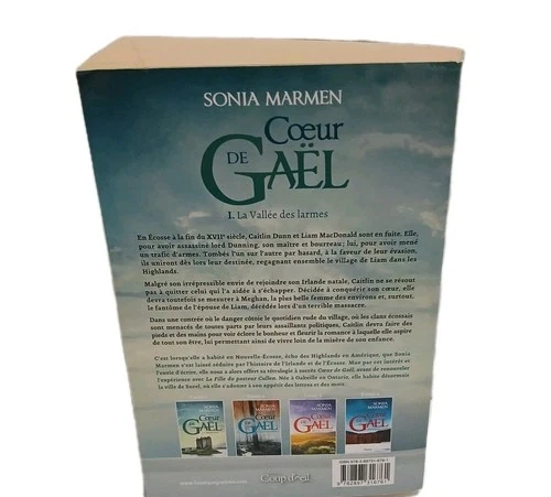 Cœur de Gaël – Tome 1 : La Vallée des larmes is the first volume of Sonia Marmen's popular historical saga. Set in Scotland in the late 17th century, this novel blends romance, drama, political intrigue, and Highland scenery. An intense story of escape, survival, and impossible love, carried by strong characters and an immersive atmosphere. A must-have for fans of historical novels, epic romance, and Quebec literature.
