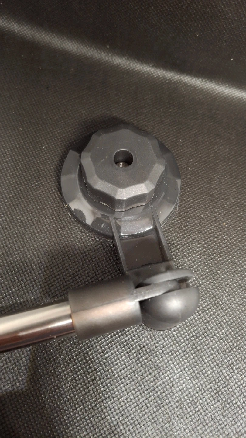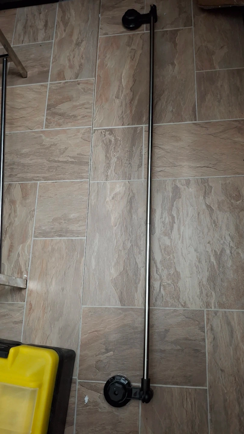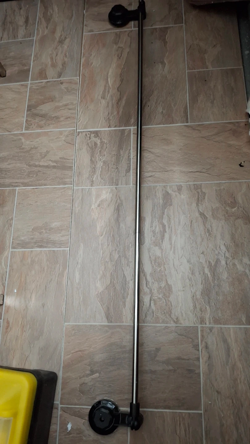 This is an adjustable shower rod holder with suction cups. It's made of metal and plastic. The holder attaches to smooth, flat surfaces for extra support.