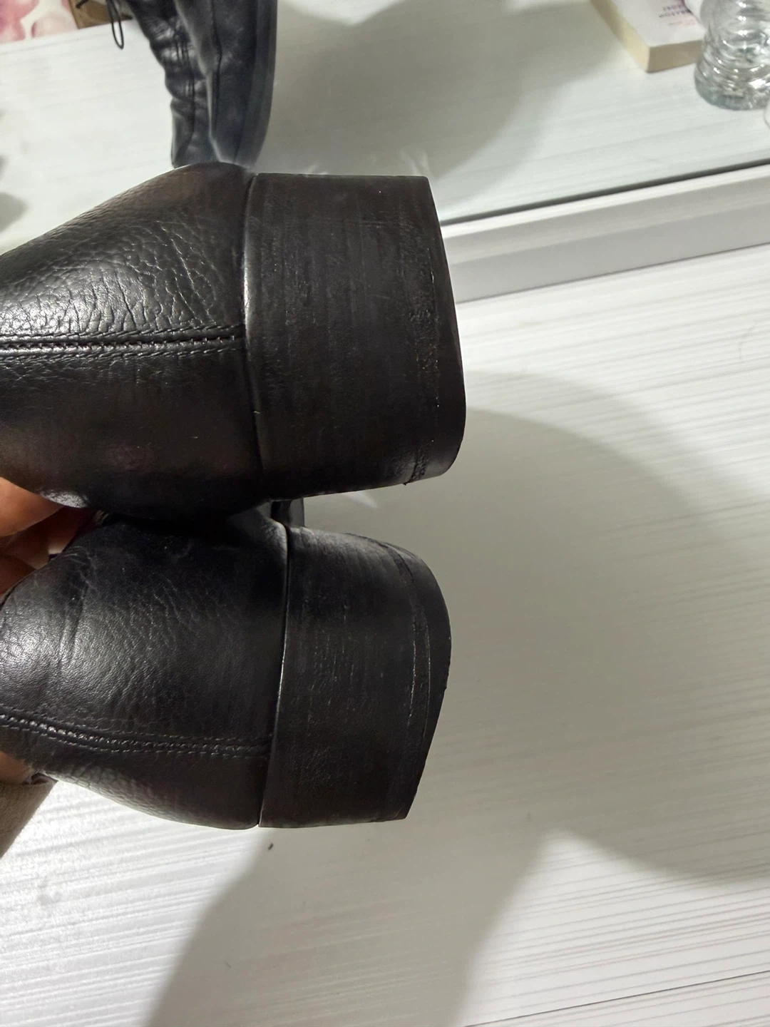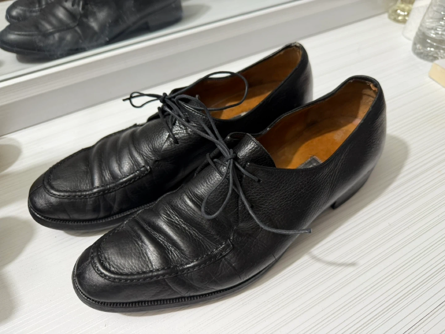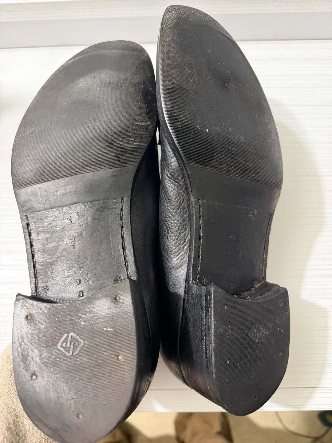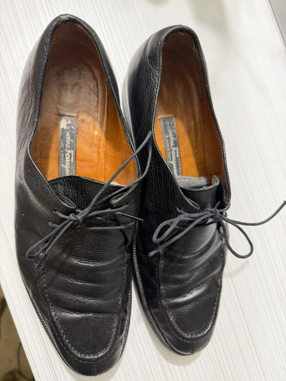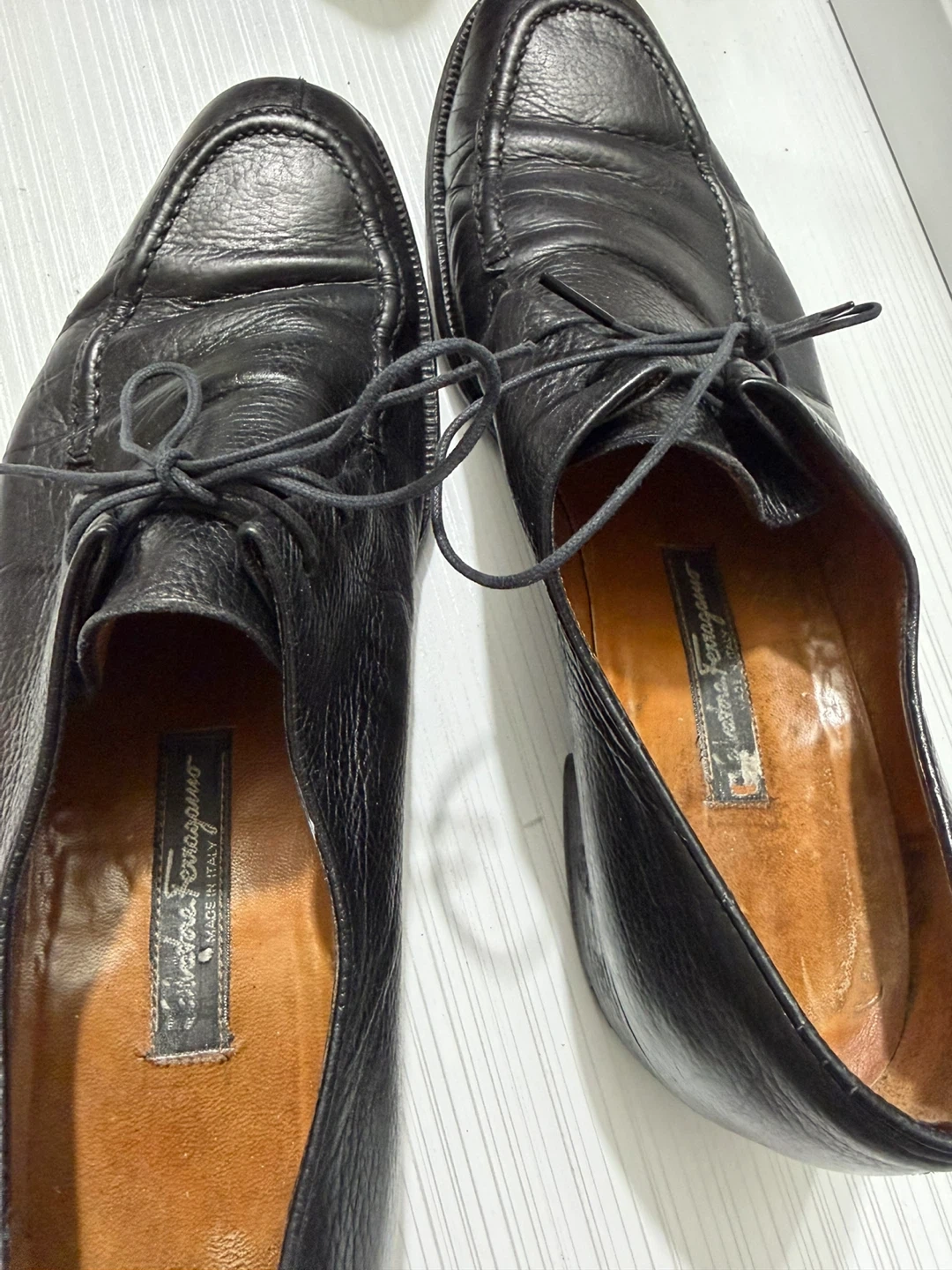 Selling a pair of Salvatore Ferragamo black leather dress shoes. They show some signs of wear but are still in good condition for everyday use!