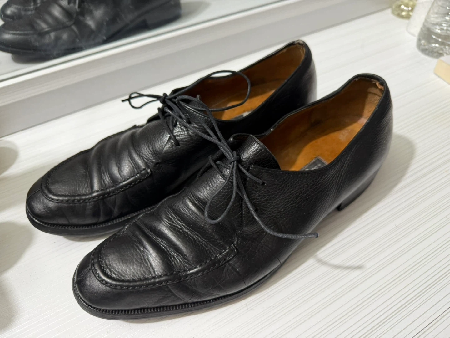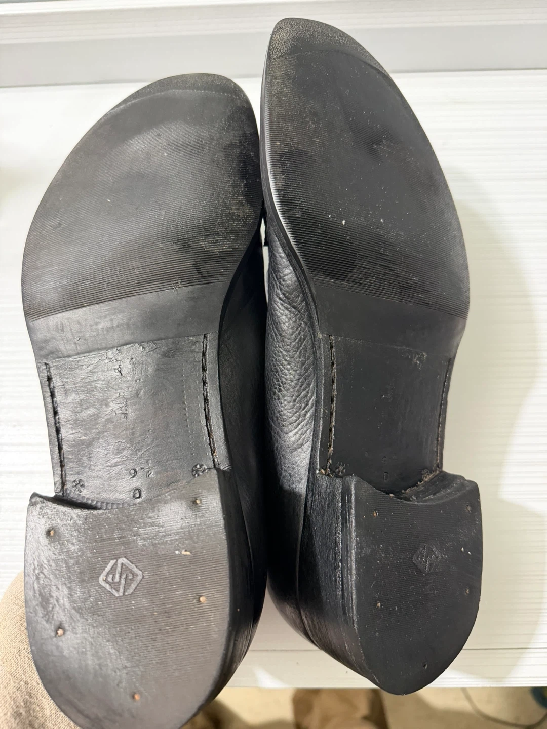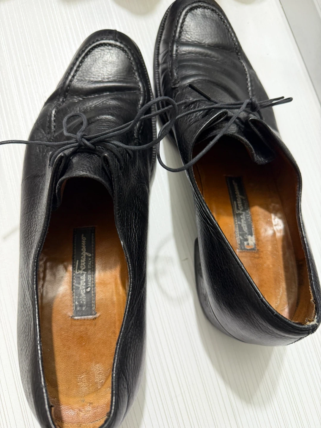 Selling a pair of Salvatore Ferragamo black leather dress shoes. They show some signs of wear but are still in good condition for everyday use!