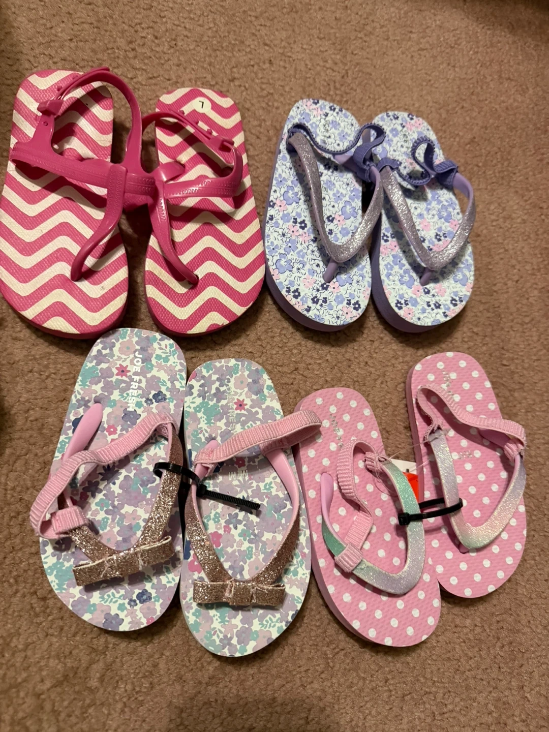 Four pairs of children's sandals and flip-flops. Includes woven straps, floral prints, and polka dots. Perfect for summer adventures!