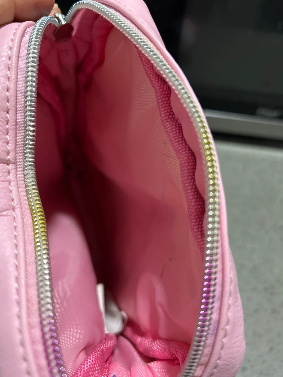 Super cute pink crossbody bag with a bow and floral pattern. It's made of faux leather with a rainbow strap. Perfect for kids to carry their essentials!