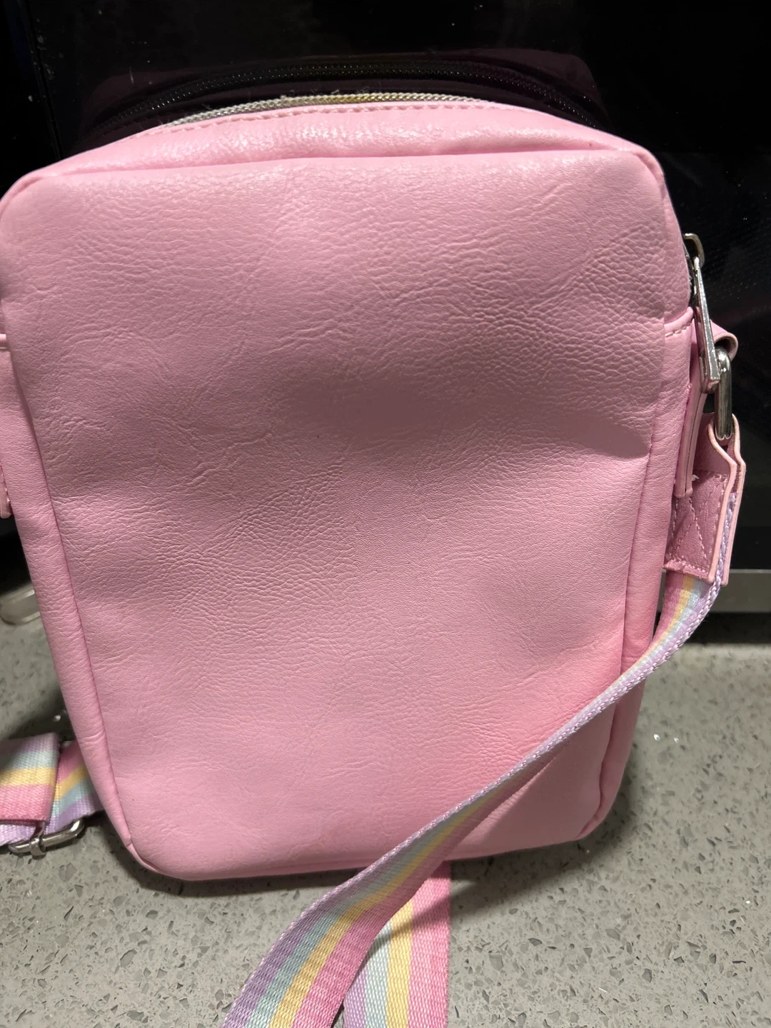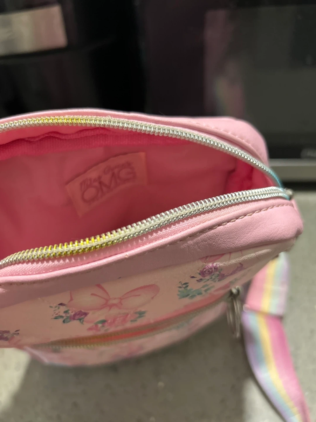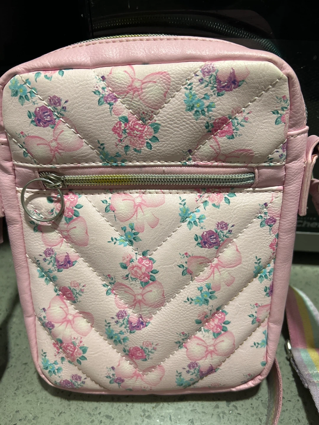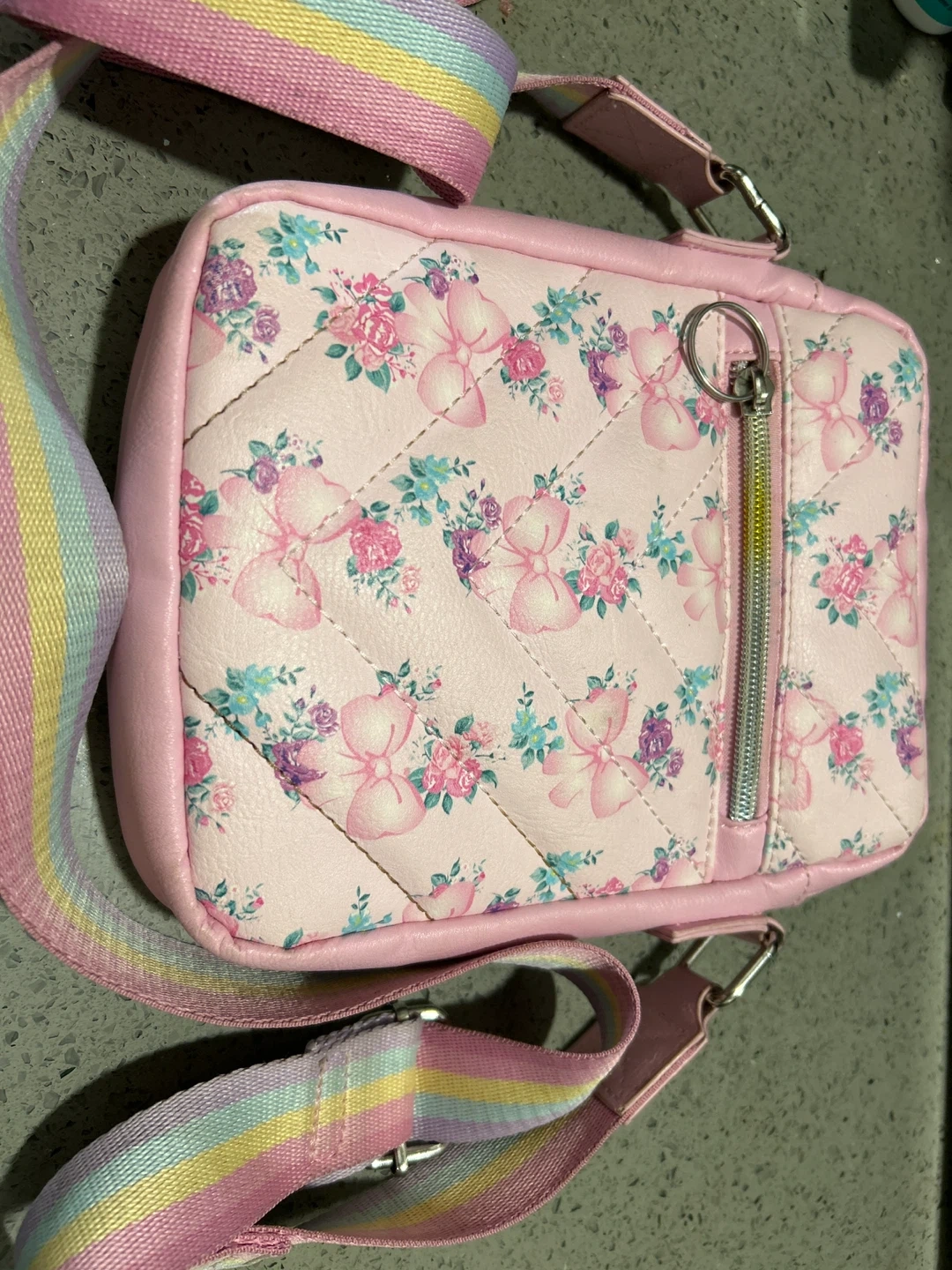 Super cute pink crossbody bag with a bow and floral pattern. It's made of faux leather with a rainbow strap. Perfect for kids to carry their essentials!