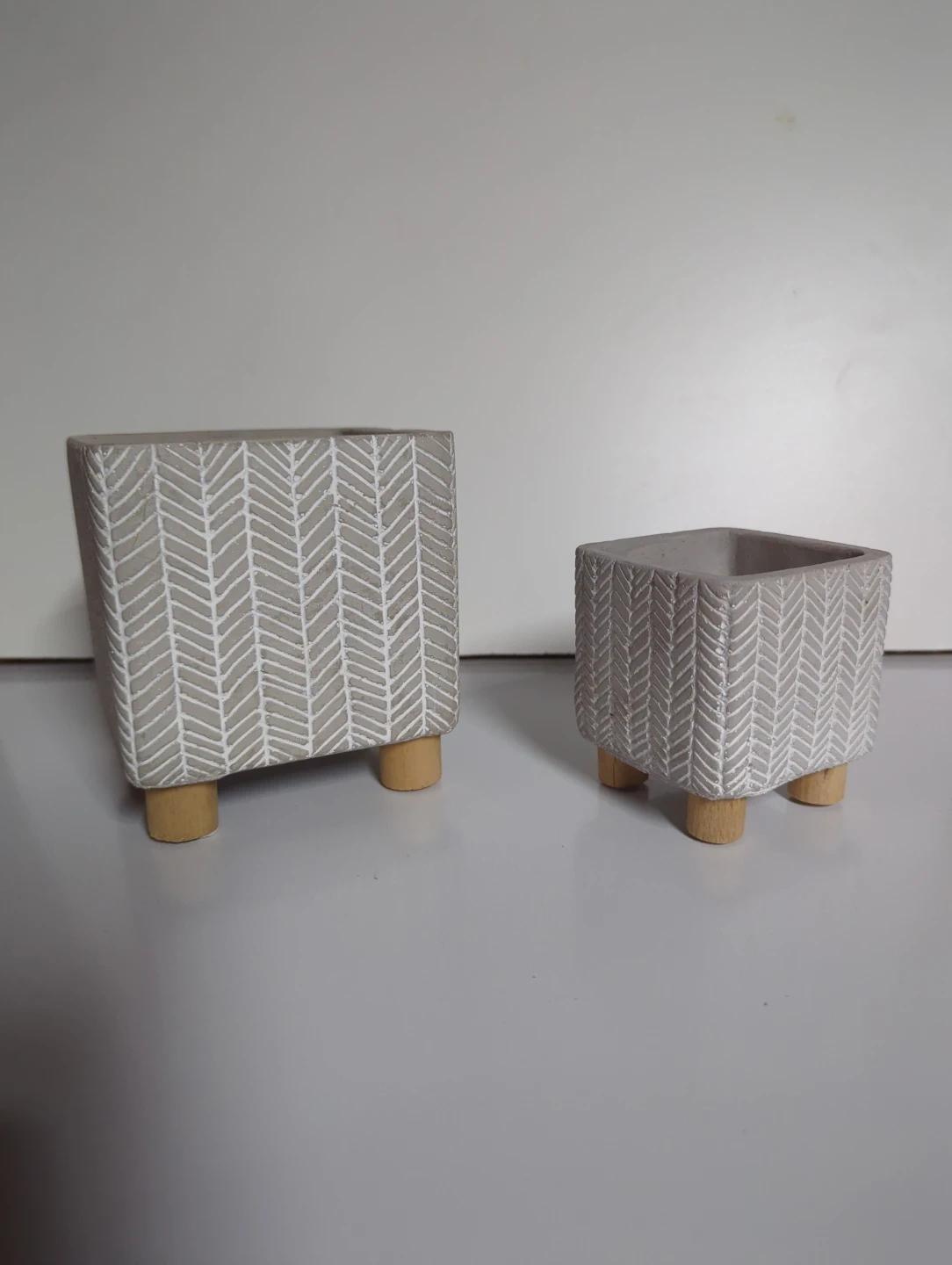 These grey ceramic planters feature a white chevron pattern and stand on short wooden legs. They're perfect for small houseplants or succulents. Adds a modern touch to any shelf or tabletop!