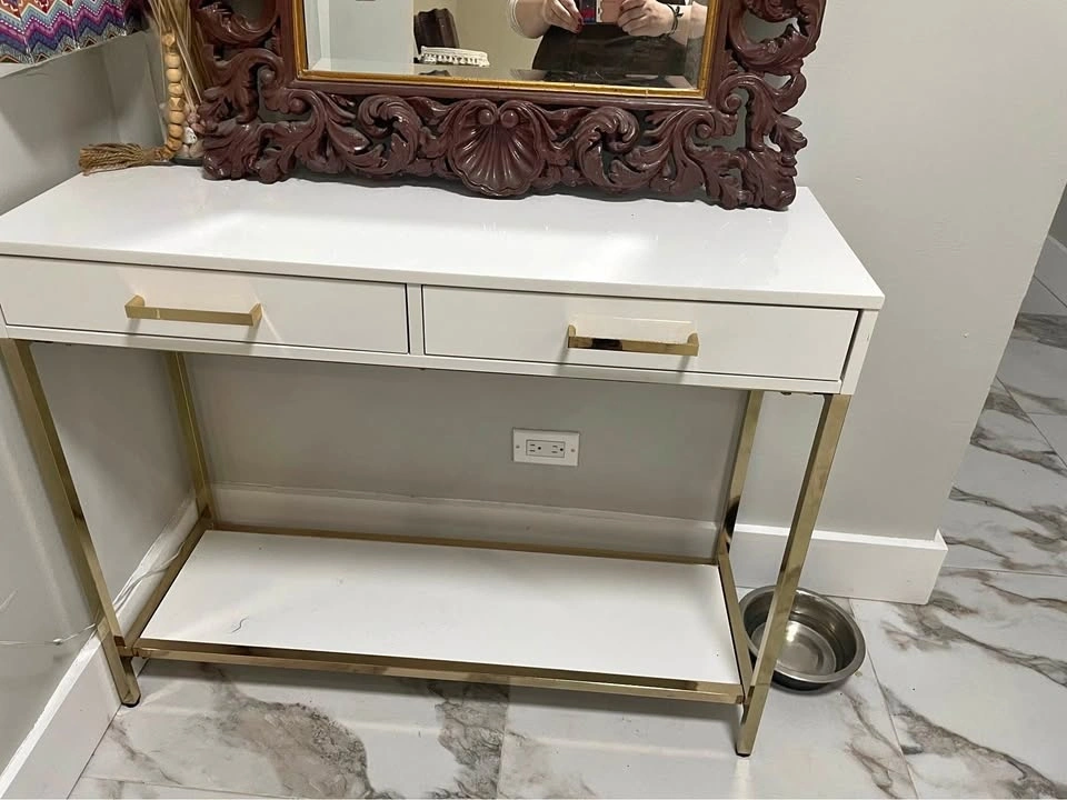 Modern white console table with gold metal frame and two drawers. Sleek, minimal design that works perfectly as an entryway table, vanity, or slim desk. Solid and sturdy. Two smooth drawers for storage. Lower shelf for baskets, books, or decor. Clean, glossy white finish with gold accents. Gently used, excellent condition. Pickup only. Elevator building.