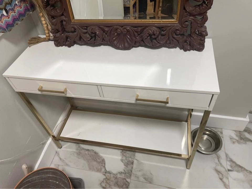 Modern white console table with gold metal frame and two drawers. Sleek, minimal design that works perfectly as an entryway table, vanity, or slim desk. Solid and sturdy. Two smooth drawers for storage. Lower shelf for baskets, books, or decor. Clean, glossy white finish with gold accents. Gently used, excellent condition. Pickup only. Elevator building.