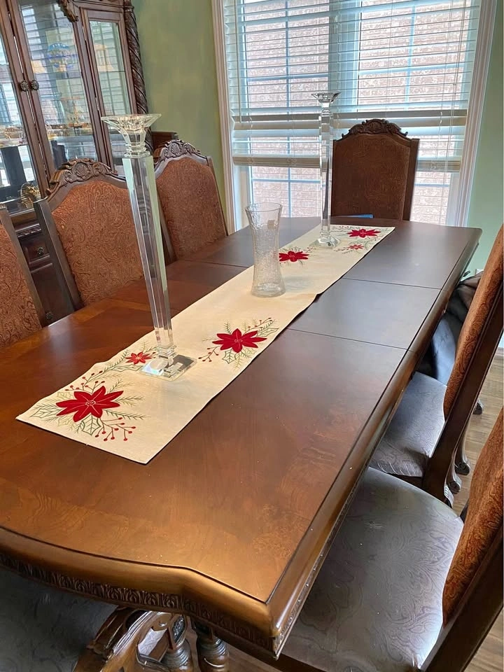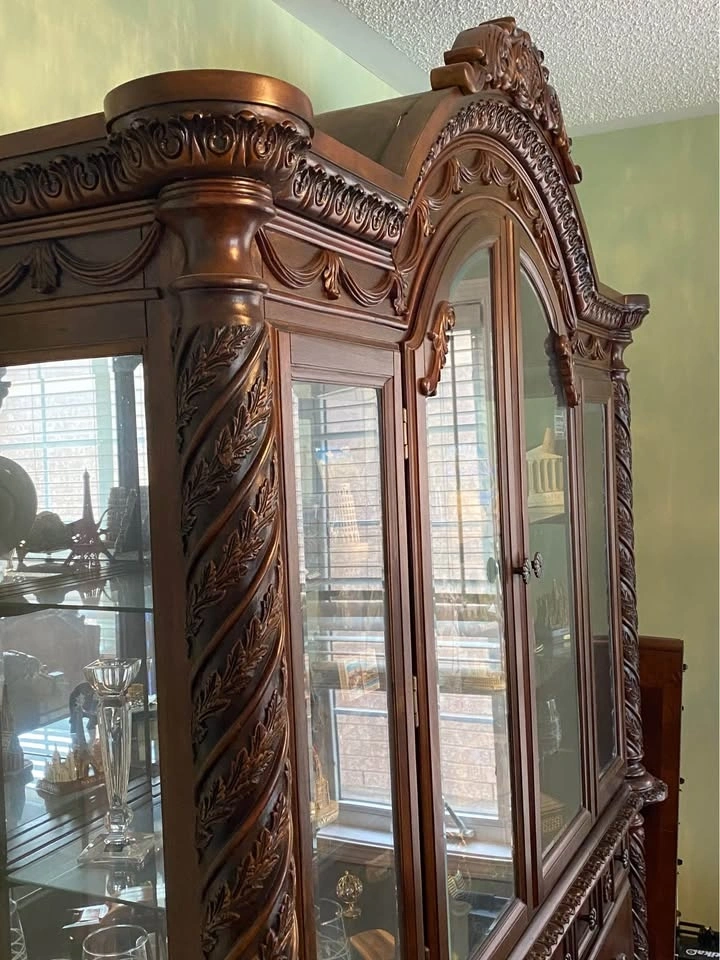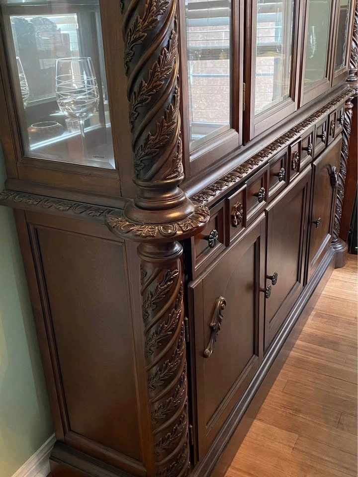 Practically brand-new dining table set, complete with 8 chairs, a middle extender, and a glass hutch. This Ashley brand set has never been used and still has the original plastic wrapping on the chairs.
