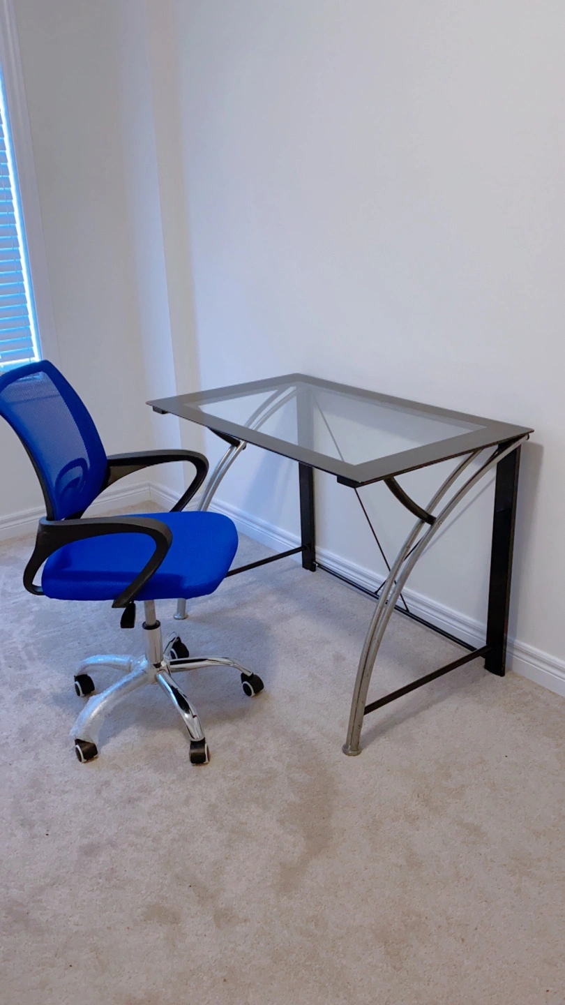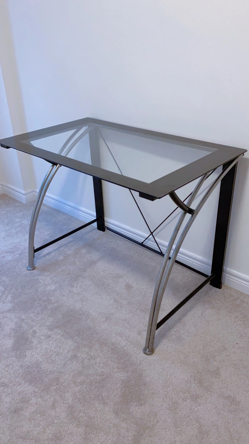 Selling a sleek glass top computer desk with a black and silver frame. It's in great shape and ready to use in your home office or study space! The desk features a modern design that will complement any decor.