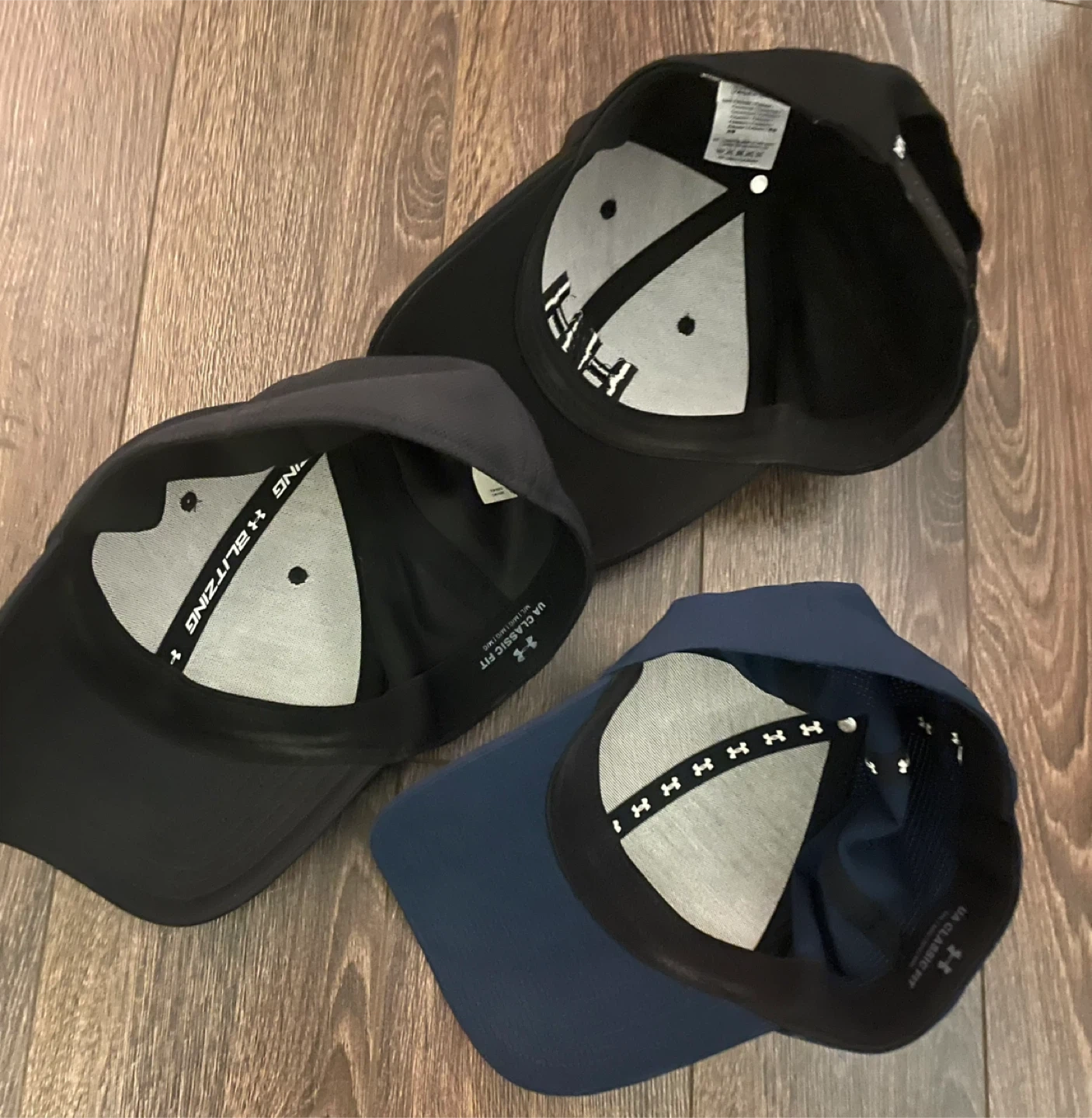 Two are Under Armour and feature the signature logo. One is a black Helly Hansen cap with an embossed 'HH' logo. They're perfect for everyday wear and keeping the sun out of your eyes!