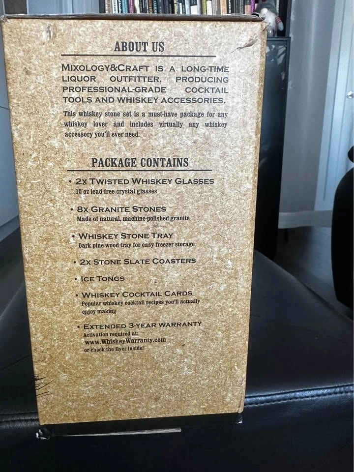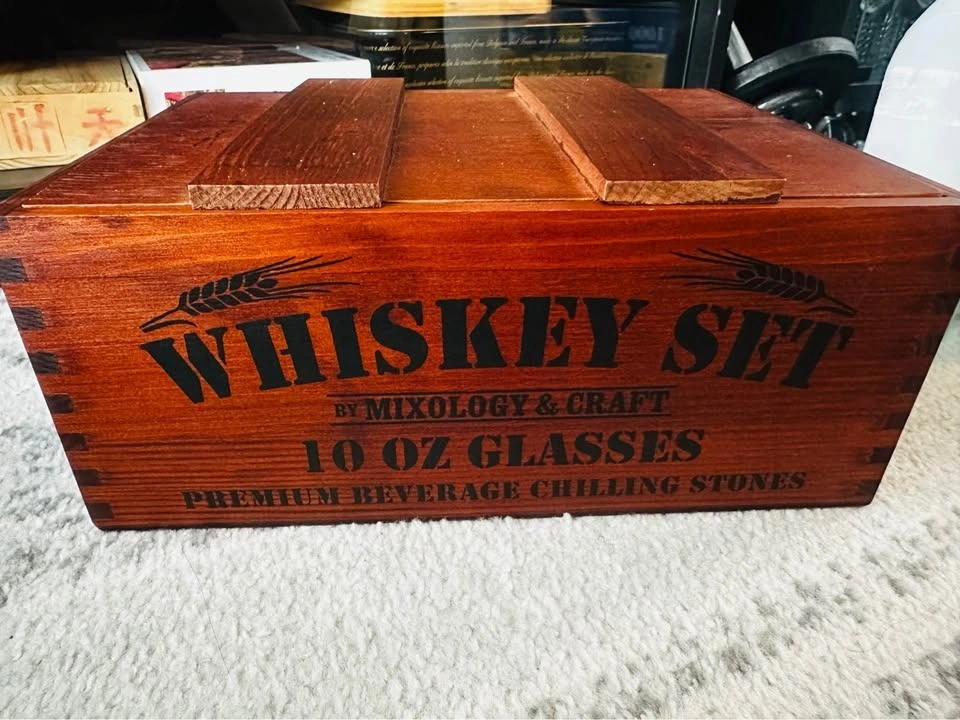 Brand new Whiskey Set by Mixology & Craft. Never used, in perfect condition — ideal as a gift. Set includes: 2 × whiskey glasses (10 oz each), premium granite chilling stones (reusable, do not dilute drinks), solid wooden storage box with engraved logo, and storage pouch with whiskey cards (as shown in photos). Details: Brand: Mixology & Craft, Condition: New – never used, Materials: glass, granite stones, solid wood box, Gift-ready presentation. Perfect for whiskey, bourbon, or scotch lovers. Great gift for birthdays, housewarming, Father’s Day, or holidays. Pickup in New Westminster (or nearby). Cash or e-transfer accepted.