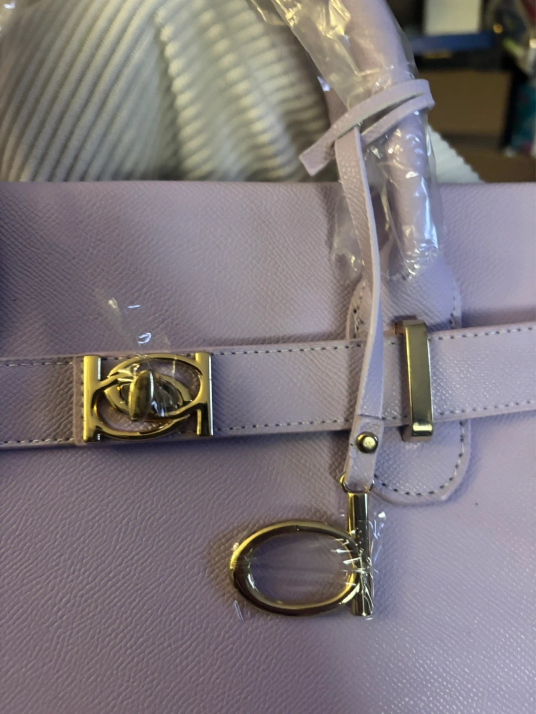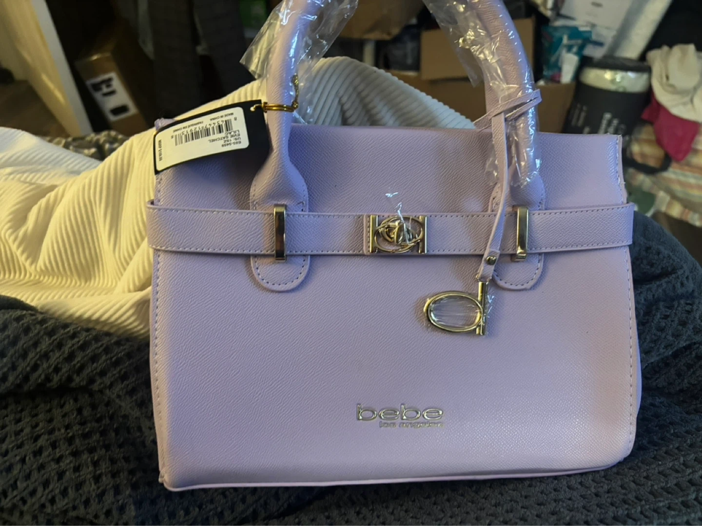 This is a new Bebe "Evie" satchel handbag in a lovely lilac color. It features gold-tone hardware and a faux leather exterior. The original MSRP was $109.00.