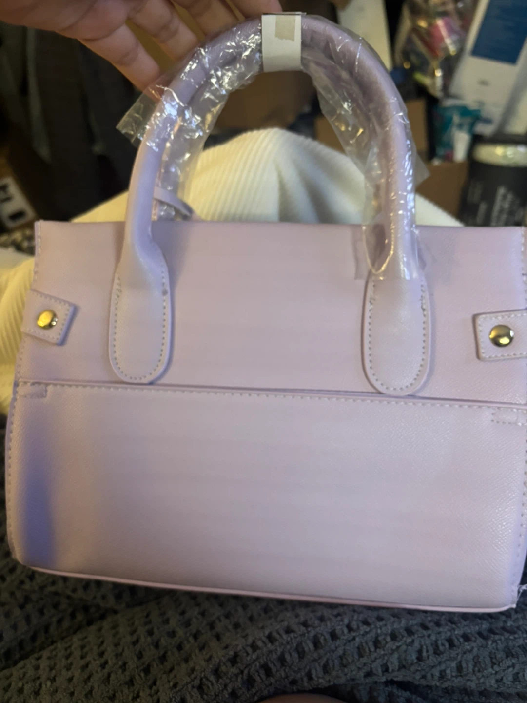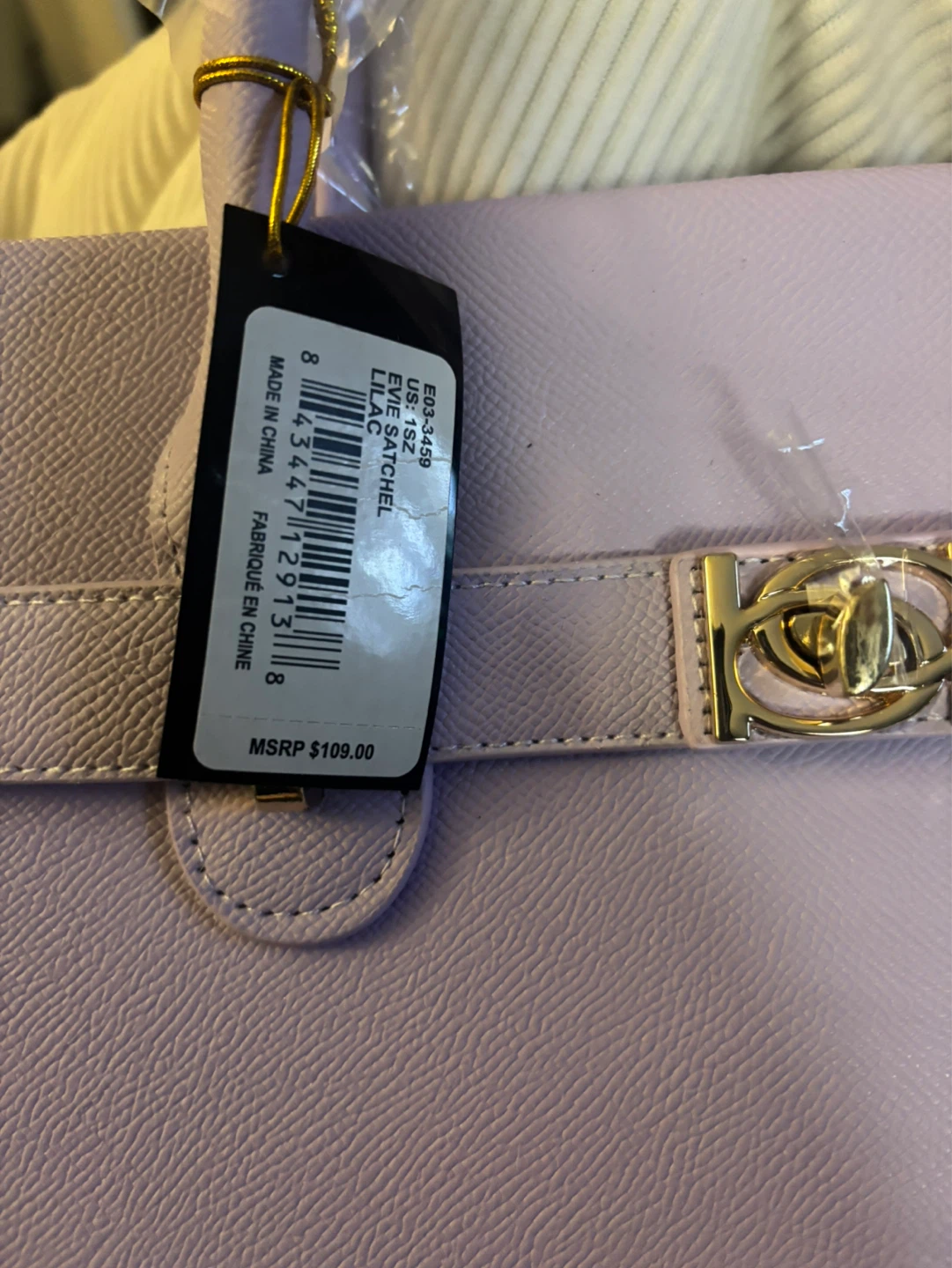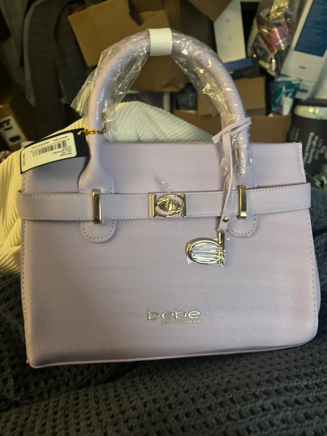 This is a new Bebe "Evie" satchel handbag in a lovely lilac color. It features gold-tone hardware and a faux leather exterior. The original MSRP was $109.00.