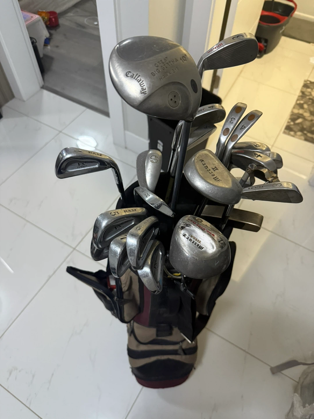 Complete set of Ram/callaway golf clubs. Includes driver, irons, and putter, all housed in a durable golf bag. This set is ready for the fairway!