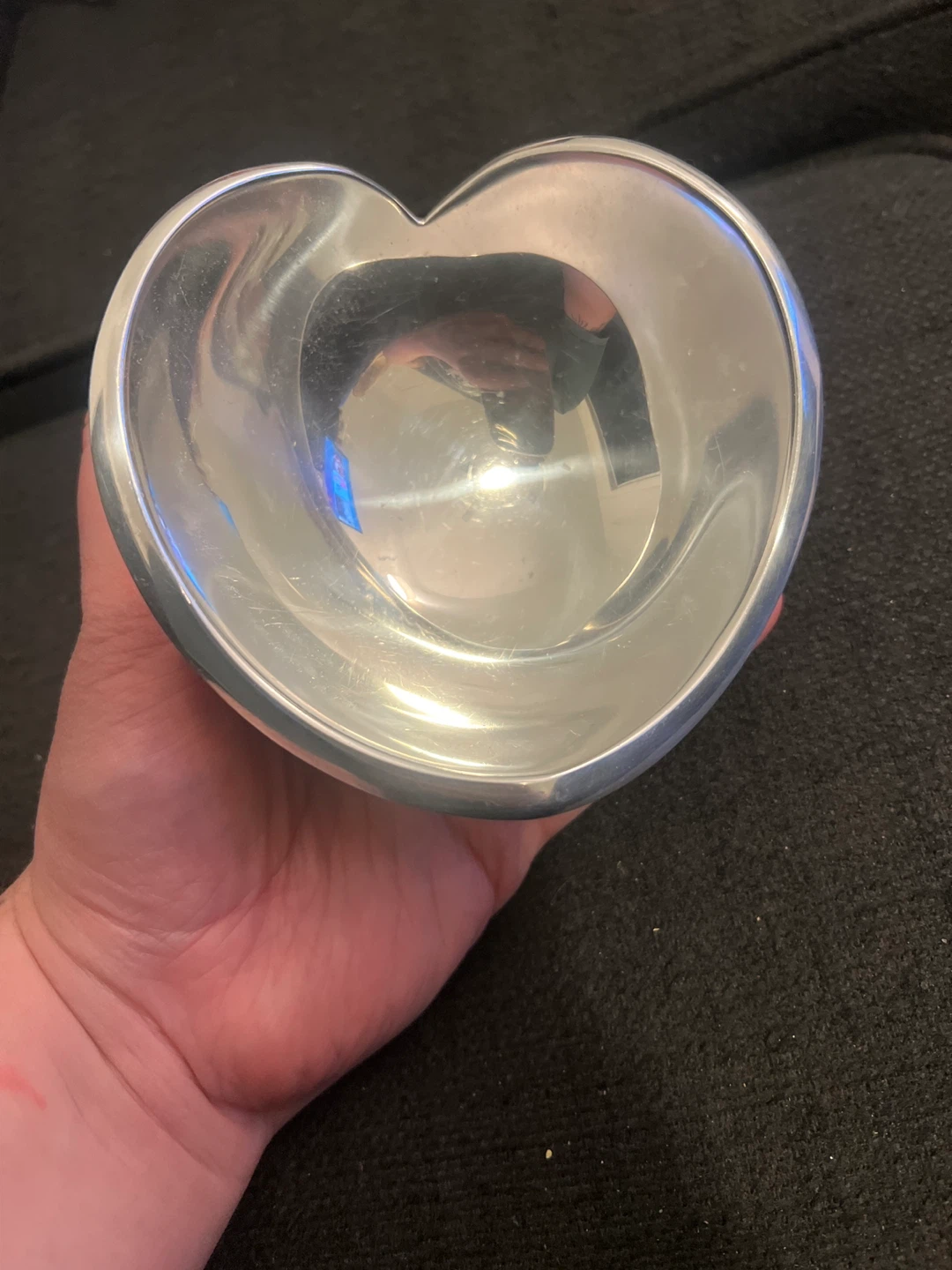 A cute little silver bowl, good for small items like jewelry, hair clips, etc.