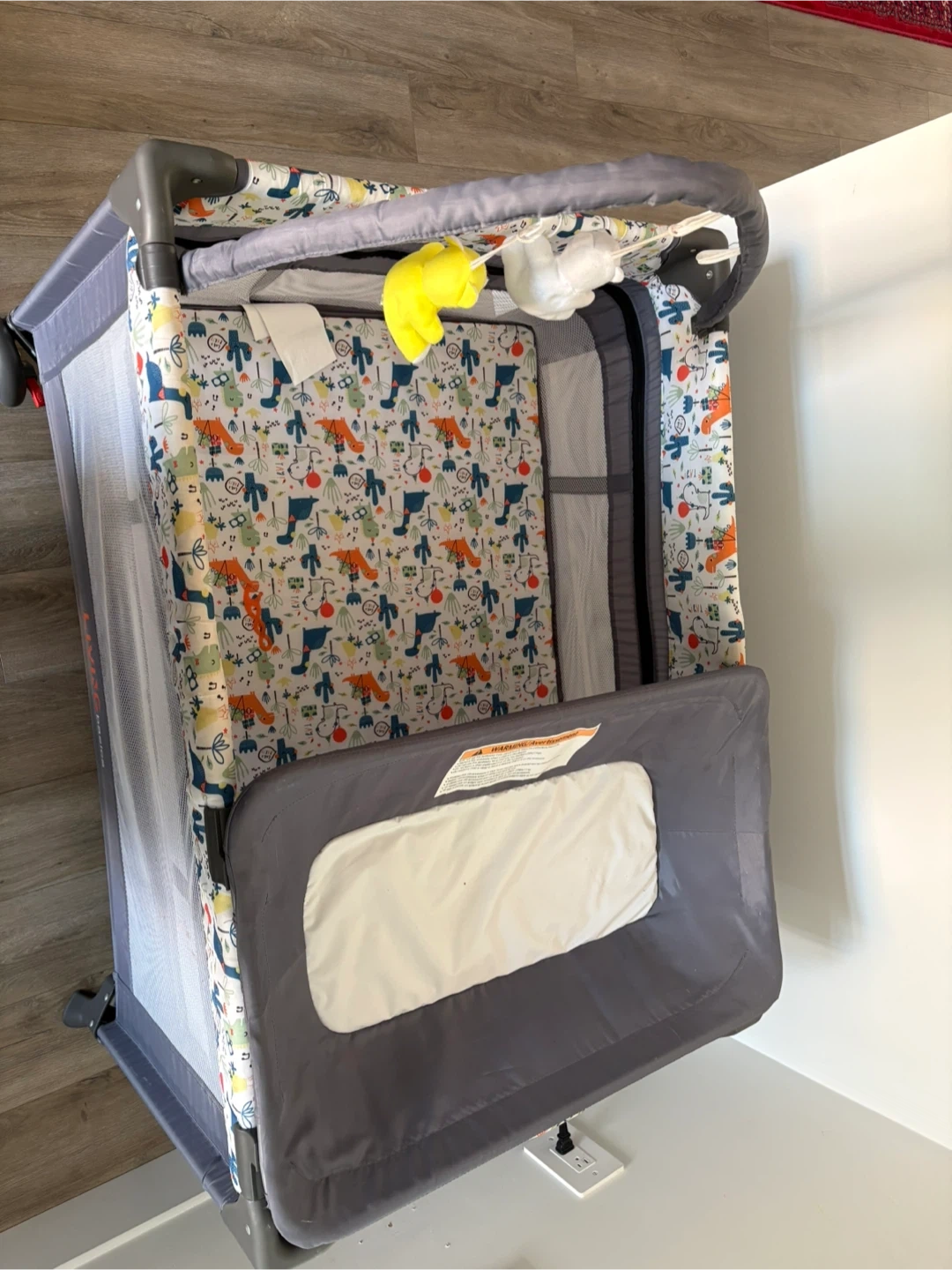 This Living Basics playpen comes with a bassinet and changing station. It features a colourful, playful dinosaur and cactus pattern on the sides. Perfect for keeping your little one entertained and safe.