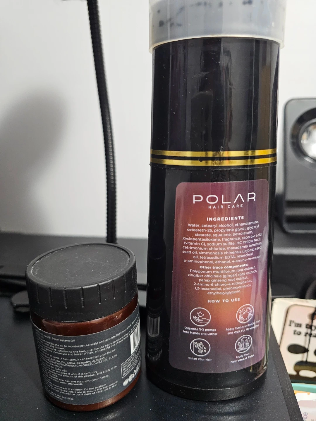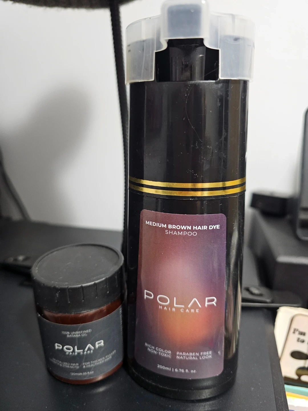 Polar Hair Care shampoo for medium brown hair dye. It's paraben-free and non-toxic, offering rich colour. The formula includes Batana Oil to moisturize the scalp and activate hair follicles. Please note that these are not full bottle.