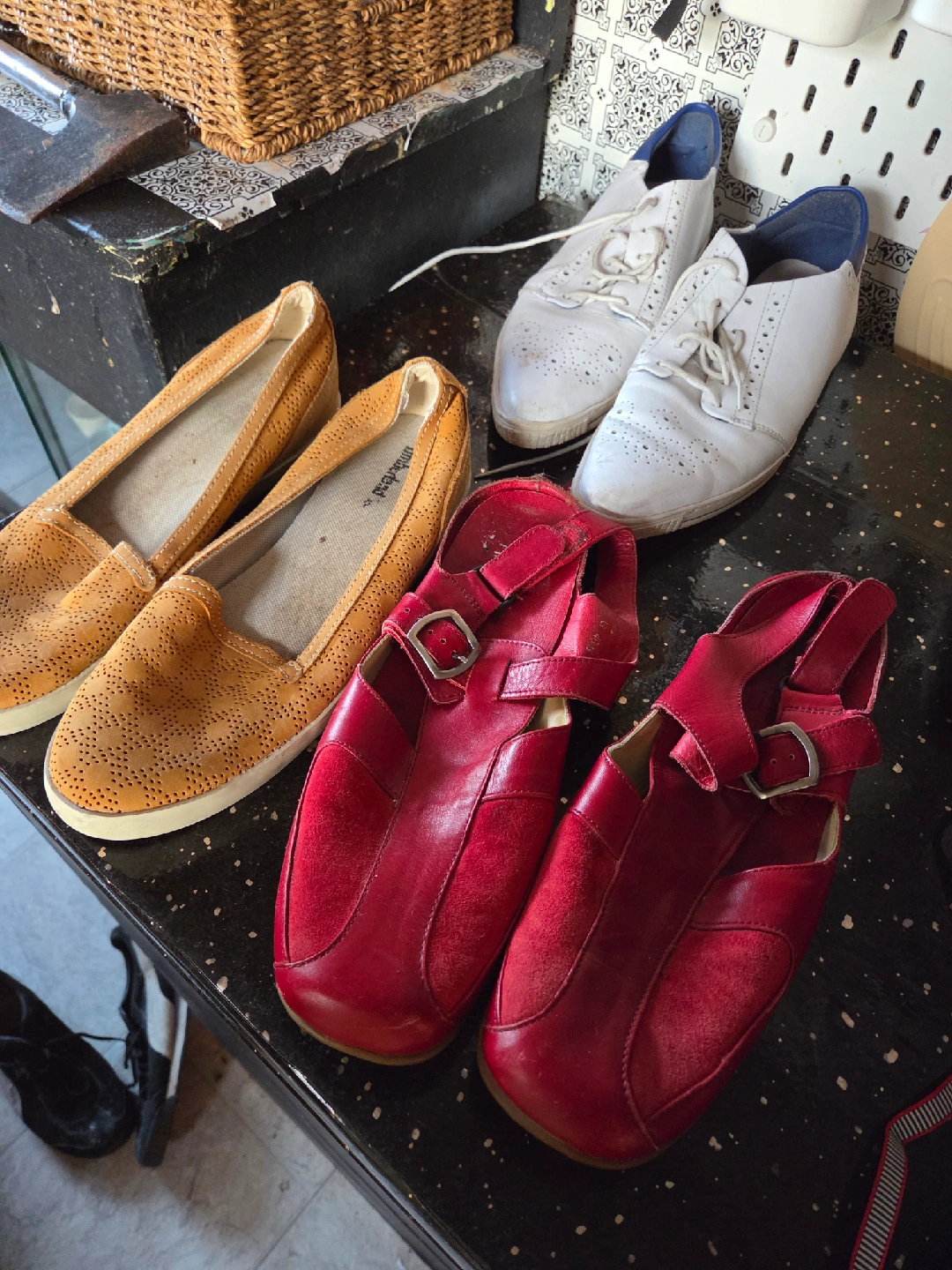 Selling a few pairs of gently used women's shoes. There's a pair of tan slip-ons, white lace-ups, and red Mary Janes. All in good condition and ready for a new home!