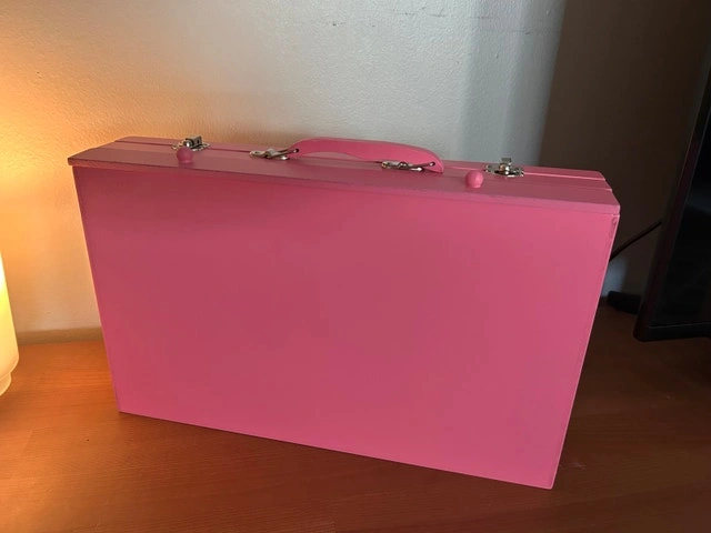 This beautiful pink wooden carrying case is perfect for hobbyists, students, or aspiring artists.