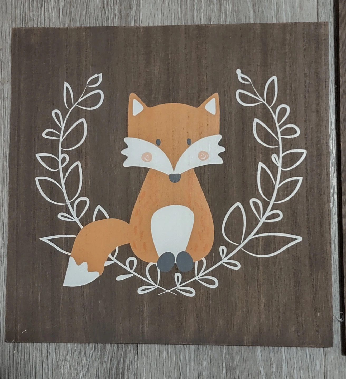 Adorable set of two square wooden prints. Features a cute fox and a bear with a heartwarming message. Perfect for a nursery or child's room. Simple, charming design. each $10. $Together $15