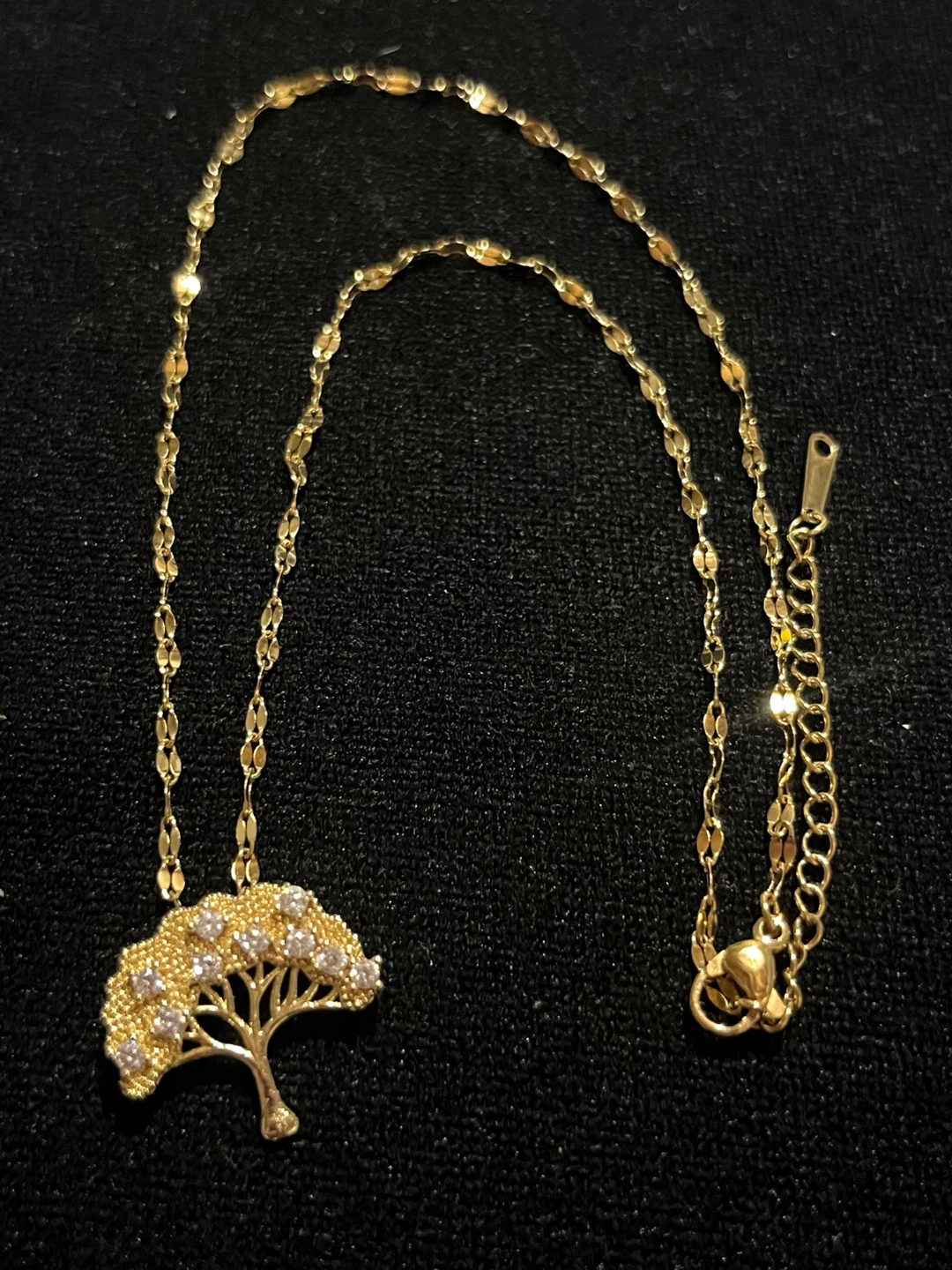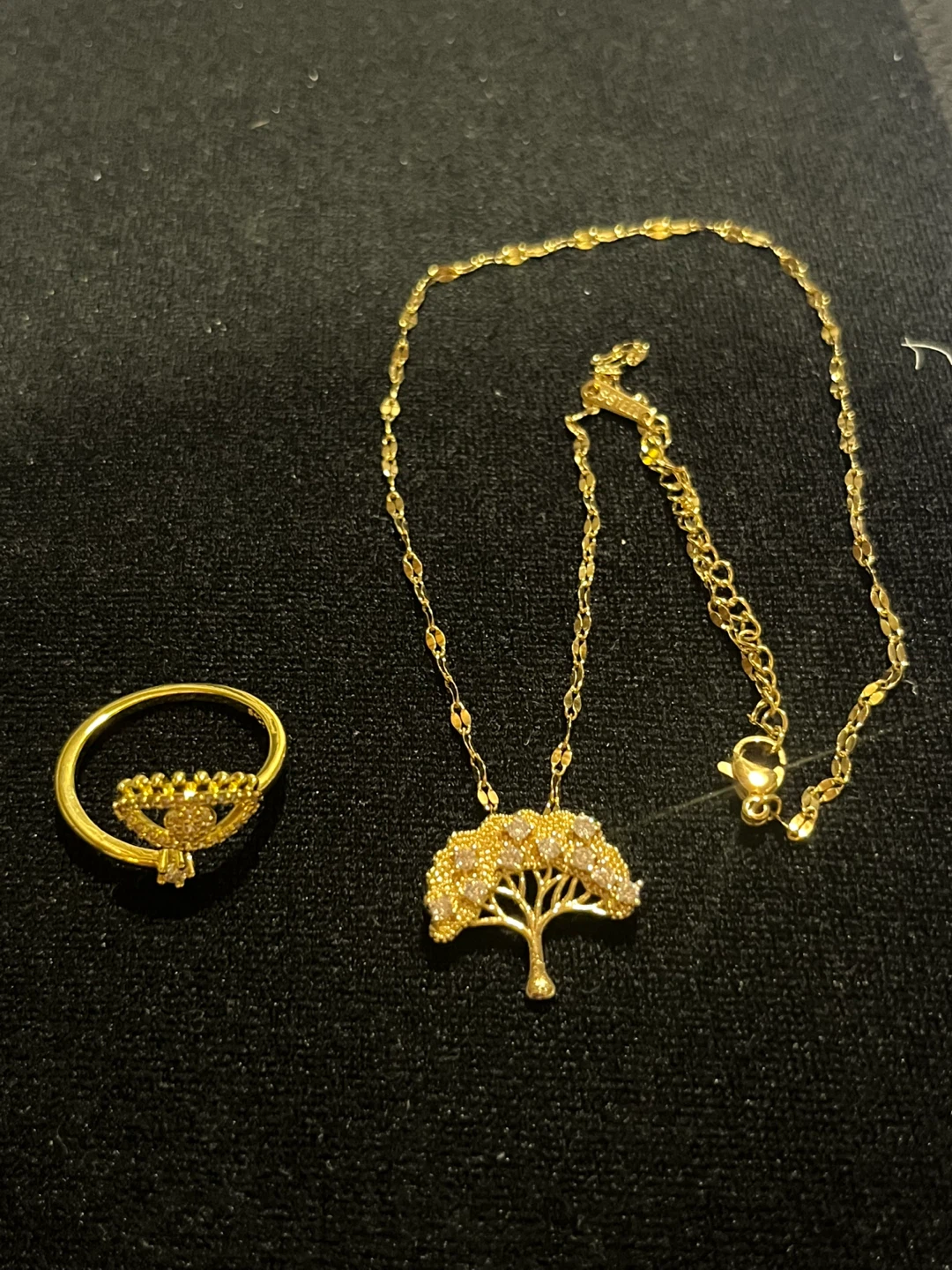 Selling a lovely golden ring and necklace set. The necklace has a beautiful tree design with small stones, and the ring complements it nicely. Perfect for adding a touch of elegance to any outfit!
