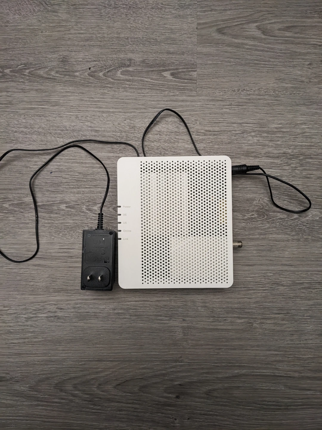 This white Technicolor modem/router comes with its original power adapter. It's ready to get you connected. Specs include various indicator lights for power, US, DS, Online, and Link.