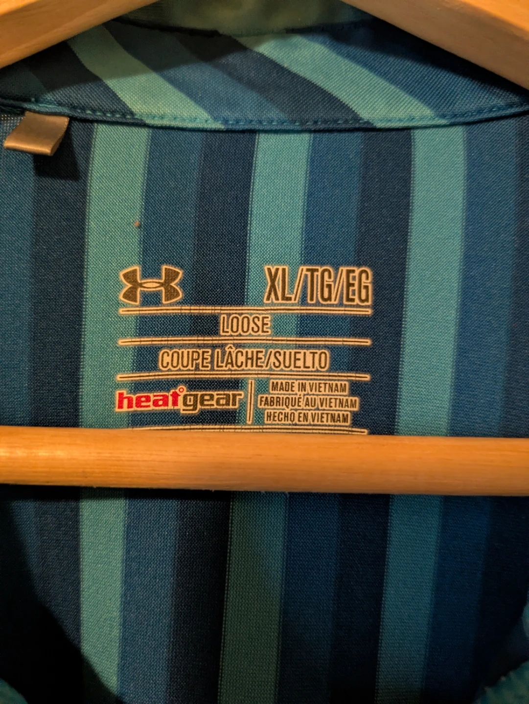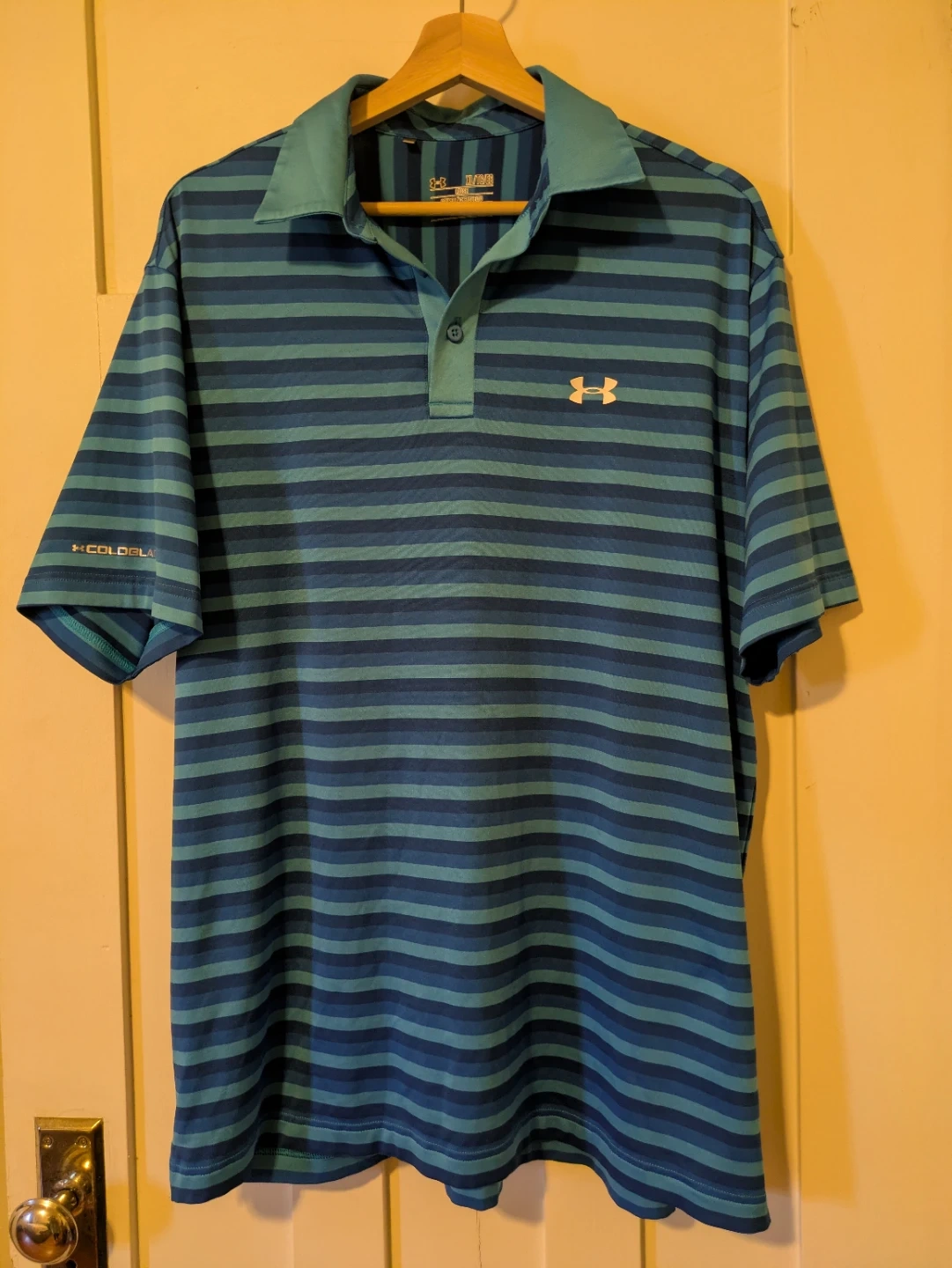 Under Armour HeatGear golf polo shirt in size XL. It's a loose fit with a blue and teal stripe pattern.