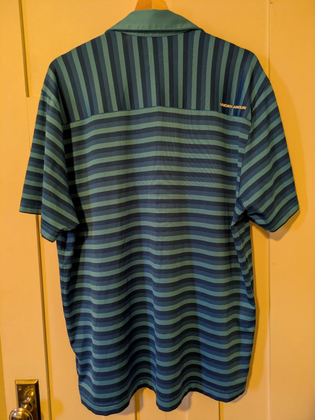 Under Armour HeatGear golf polo shirt in size XL. It's a loose fit with a blue and teal stripe pattern.