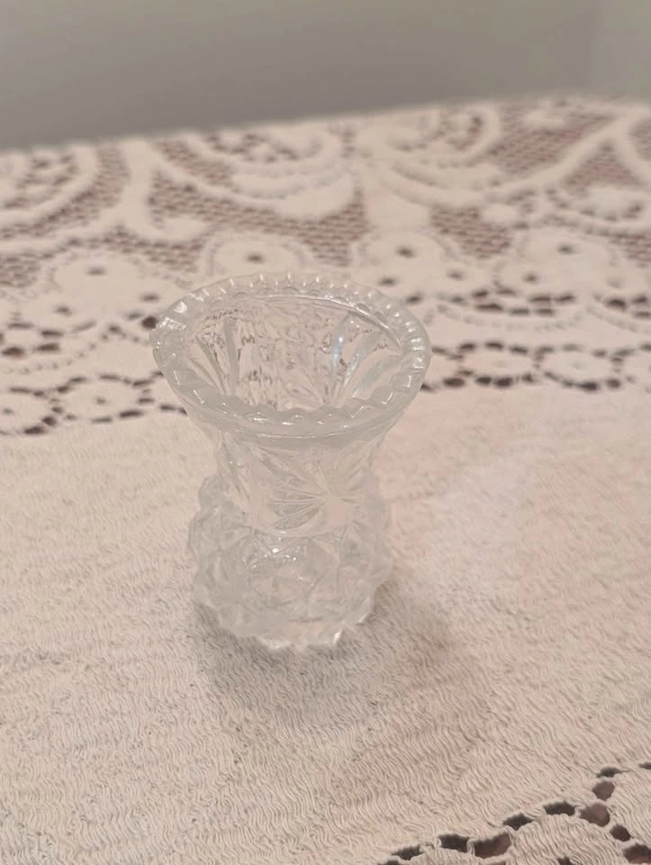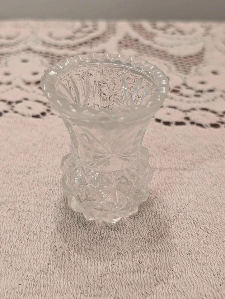 Patterned clear glass vase with a geometric and starburst design. Perfect for small flowers or a votive candle. Marked 'MADE IN TAIWAN' on the bottom.