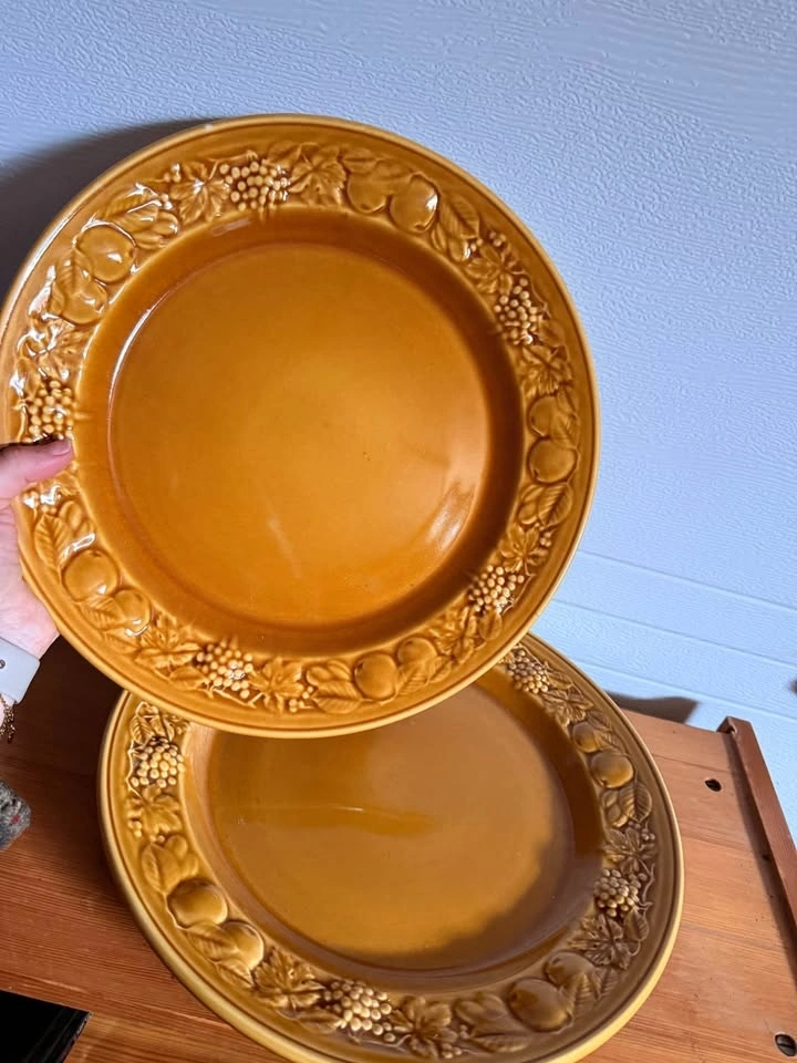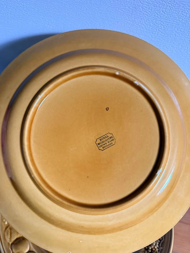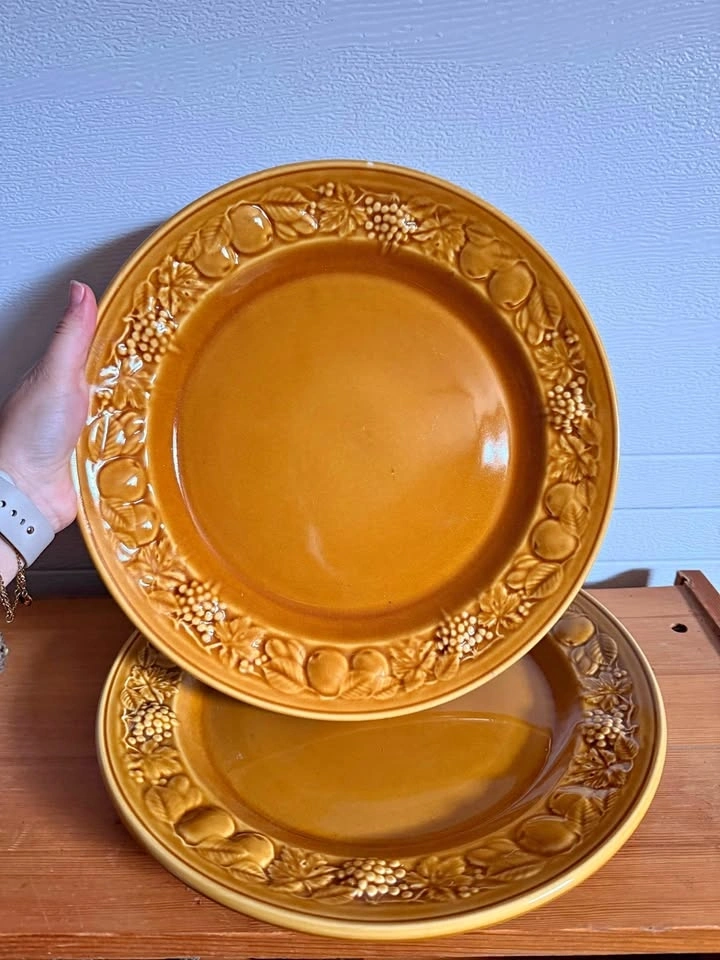 Vintage Royal Worcester Crown Ware large serving plates. This set has 2 ceramic plates. They are a warm amber color with an embossed fruit and leaf design on the rim. Made in England. $8 each or $15 for the set.