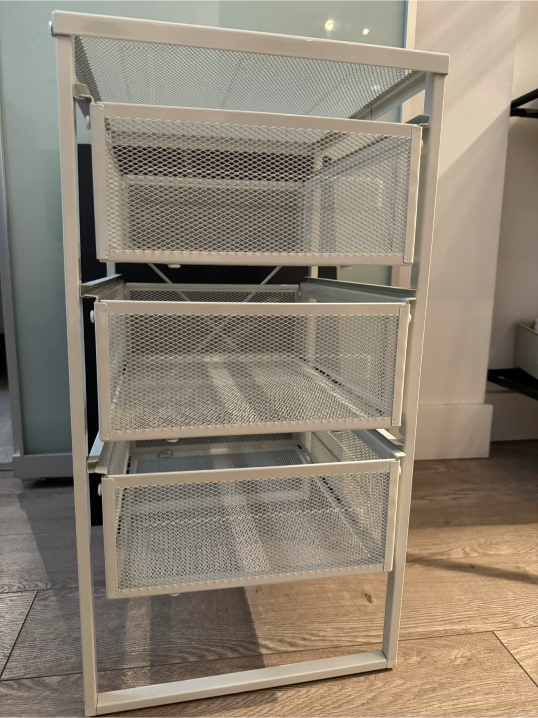 Selling a handy white metal storage cart! It features three mesh drawers, perfect for organizing various items around the house. Great for adding extra storage to your space