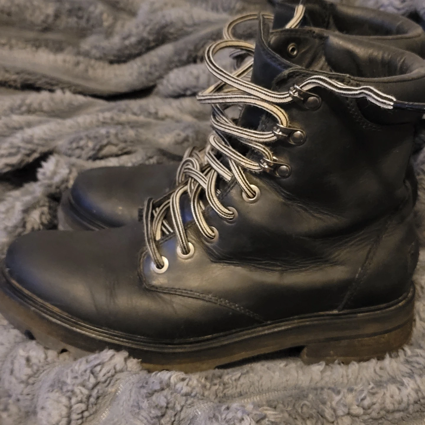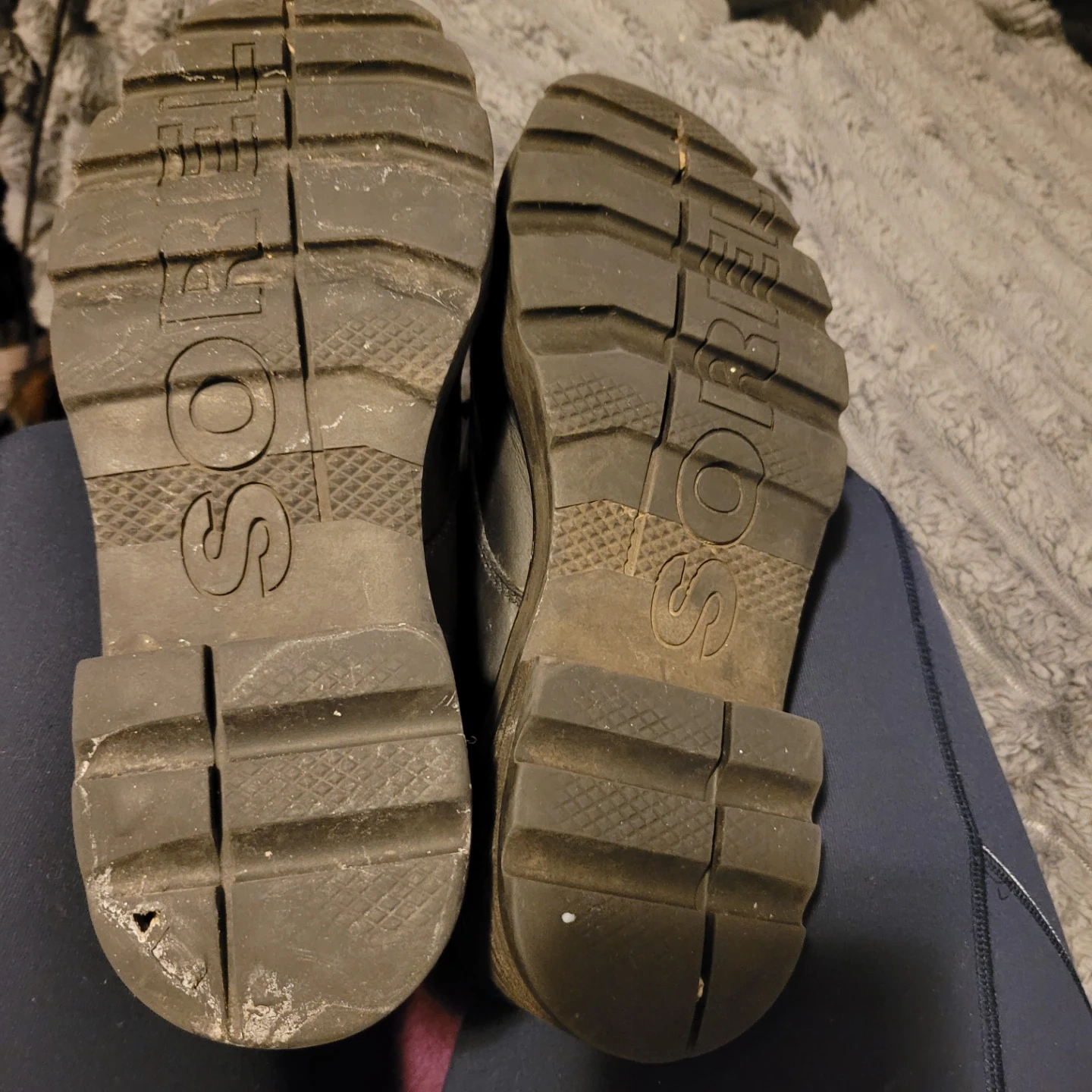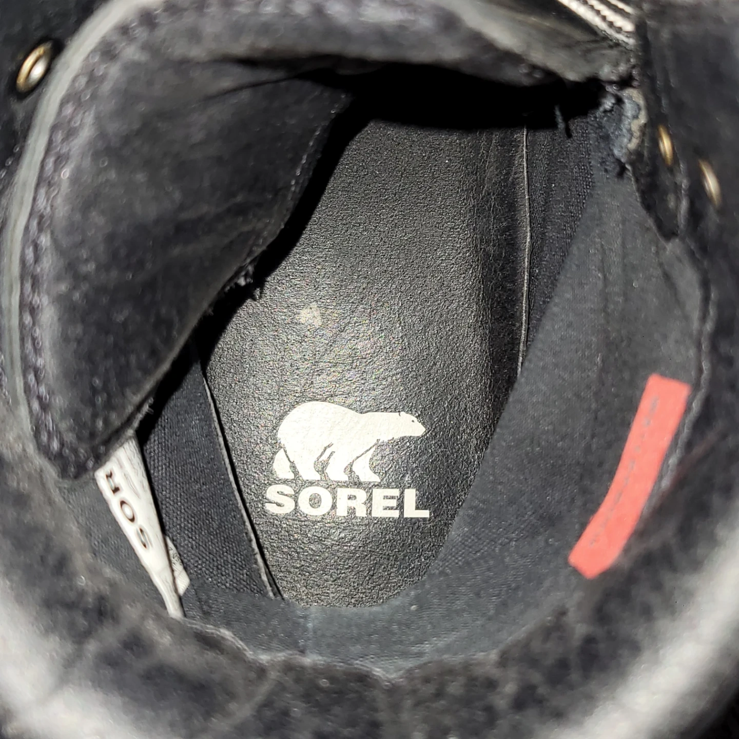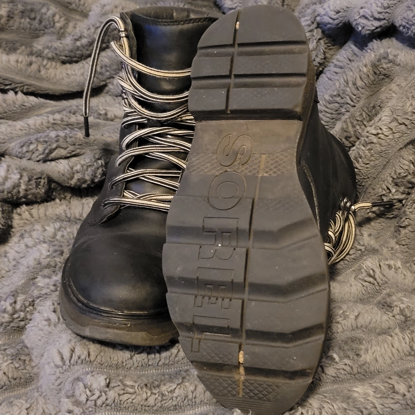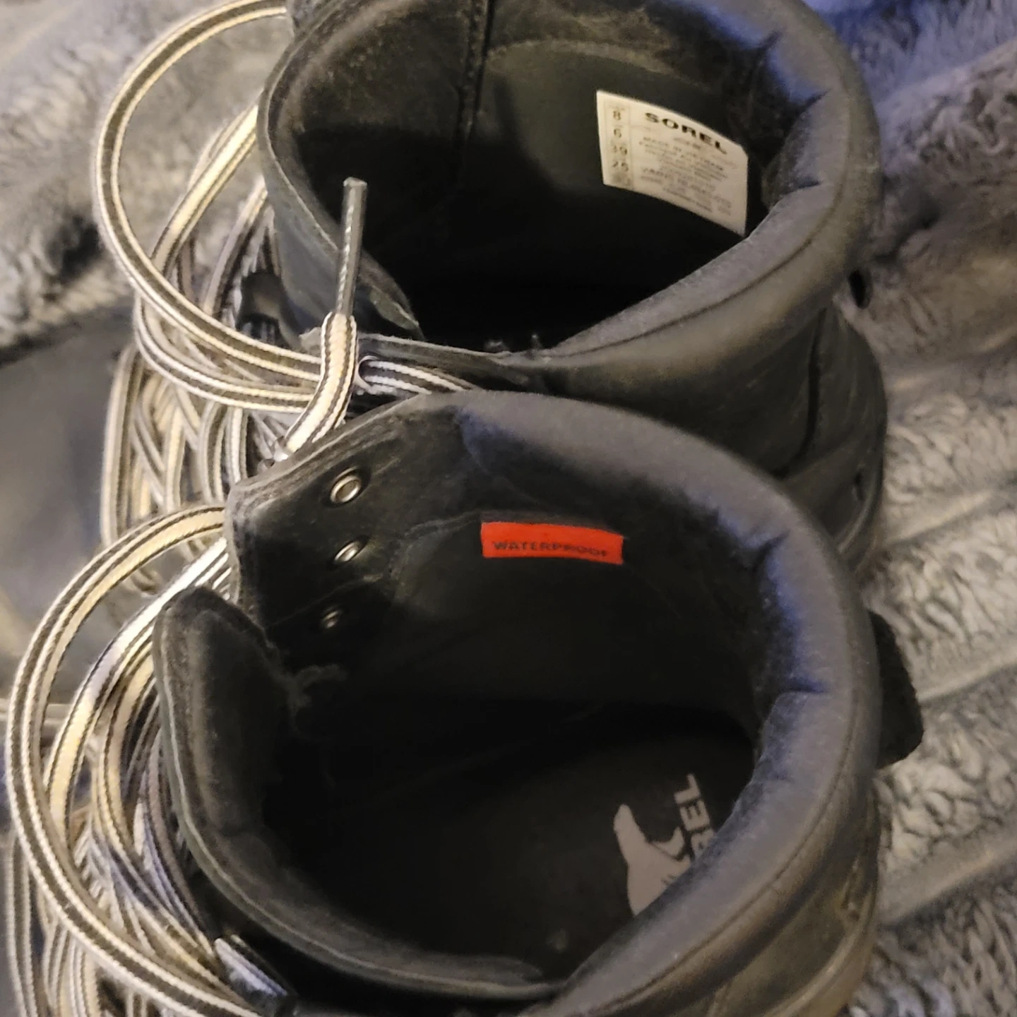 Black Sorel waterproof winter boots in size 8. These boots are made in Vietnam. They're great for cold weather conditions!