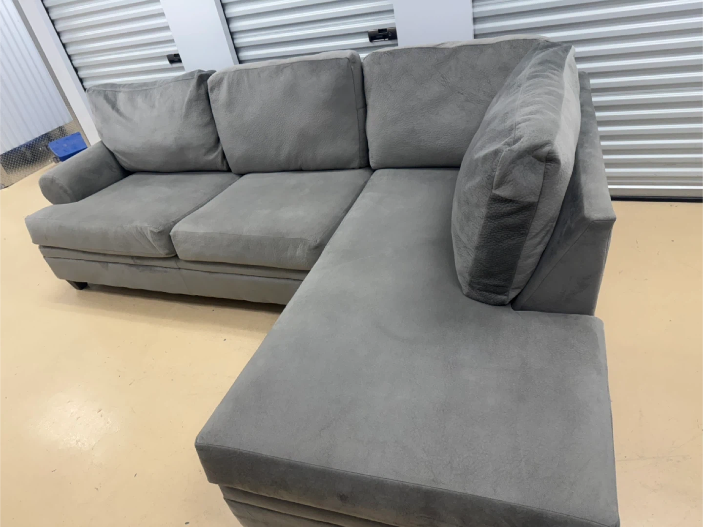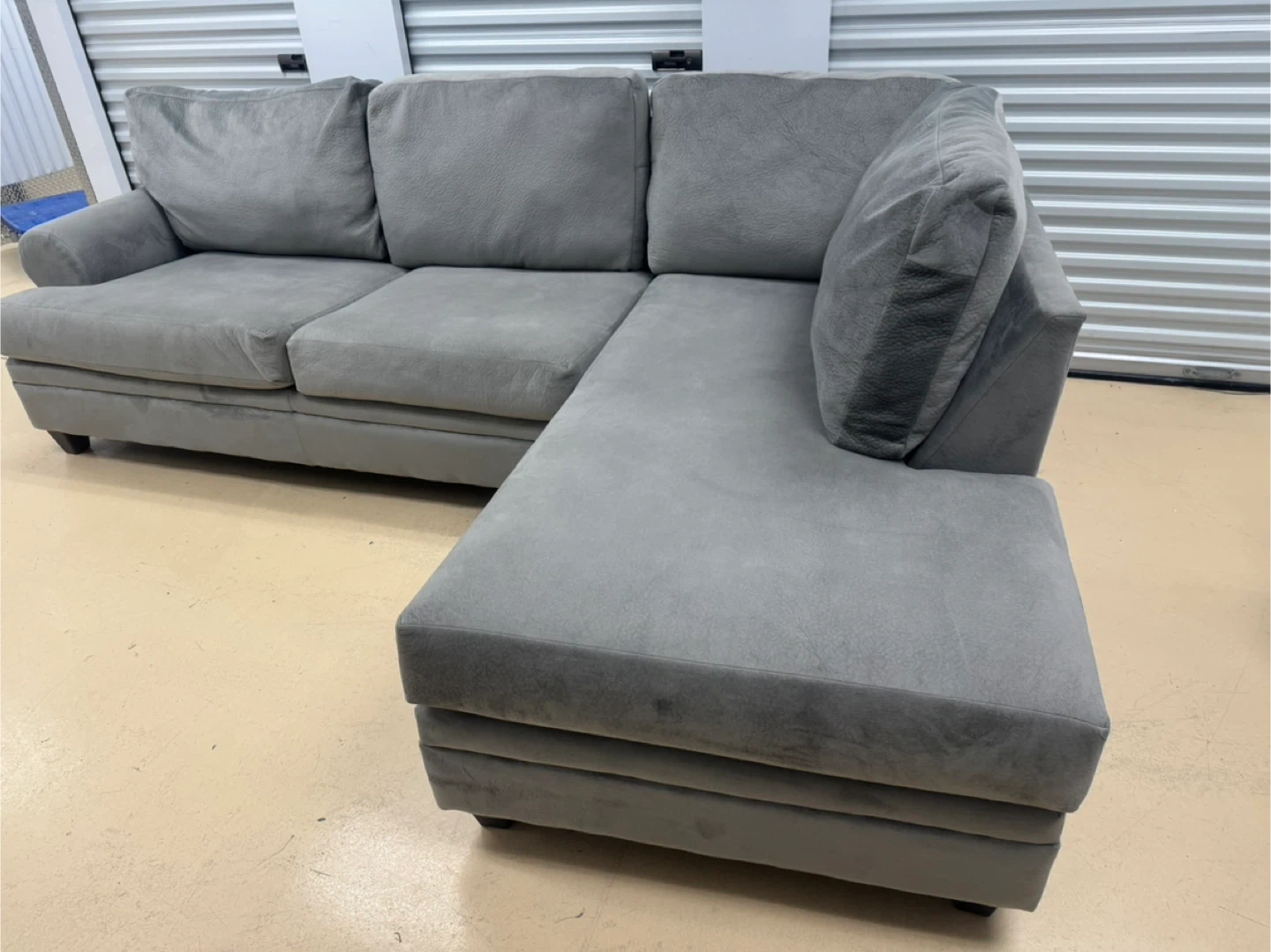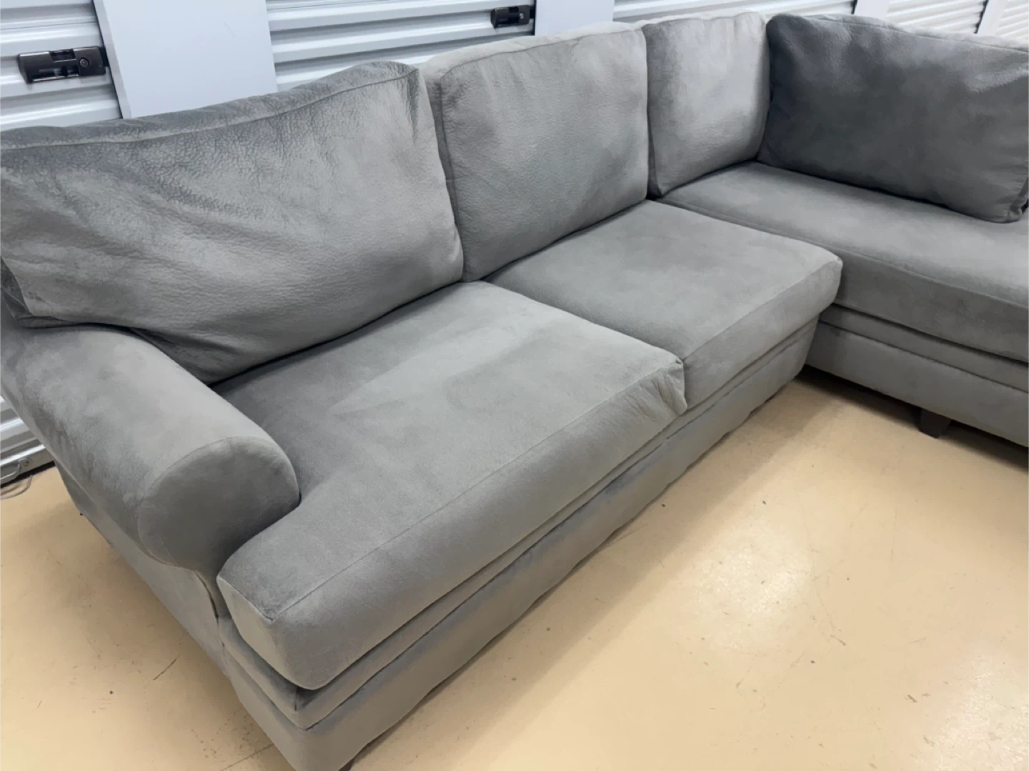 A comfortable grey sectional sofa. It's made of a soft fabric material. This sofa is great for lounging in your living room.good condition home delivery available