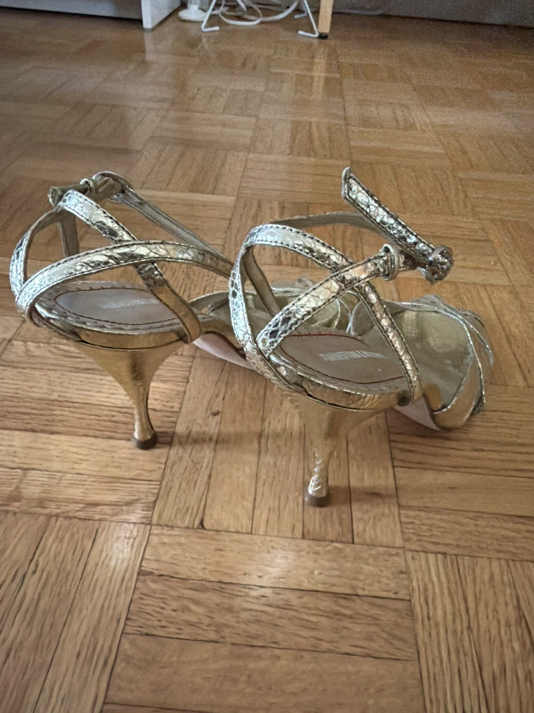Elegant gold strappy heels from Johnston & Murphy. These shoes feature a stylish design with ankle straps and a comfortable heel height. Perfect for dressing up any outfit!