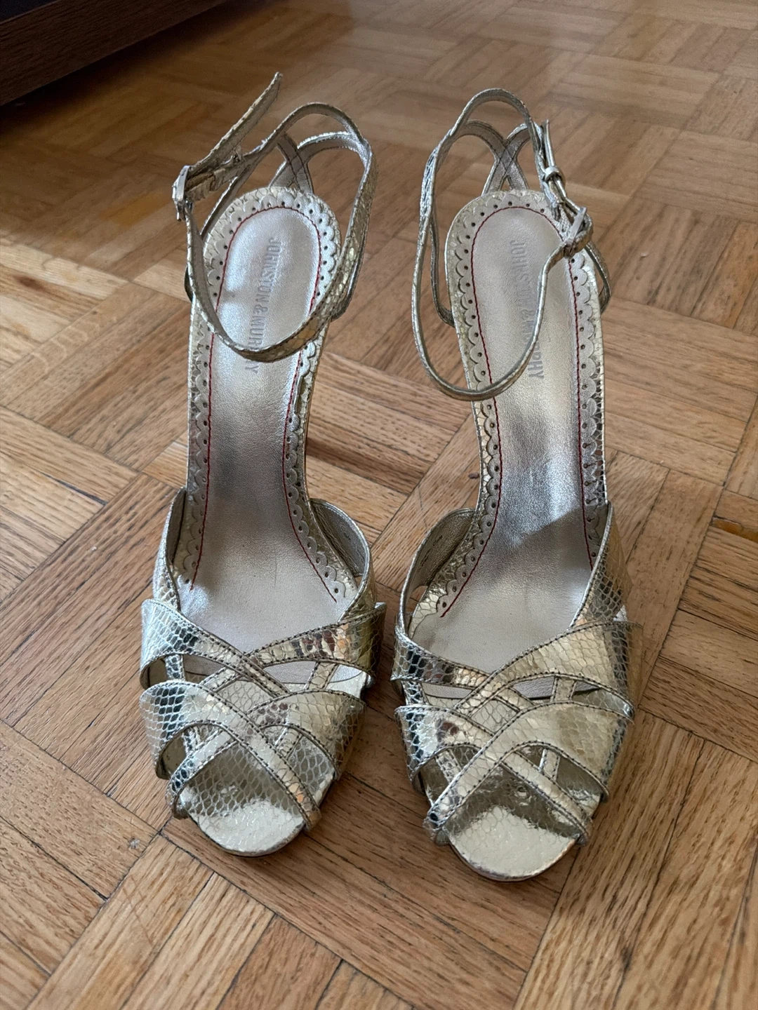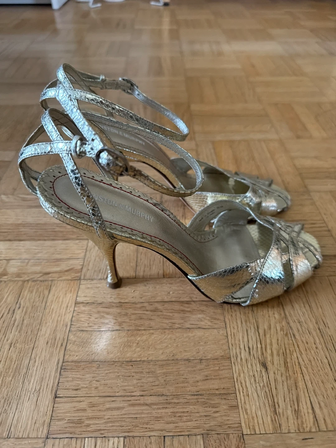 Elegant gold strappy heels from Johnston & Murphy. These shoes feature a stylish design with ankle straps and a comfortable heel height. Perfect for dressing up any outfit!