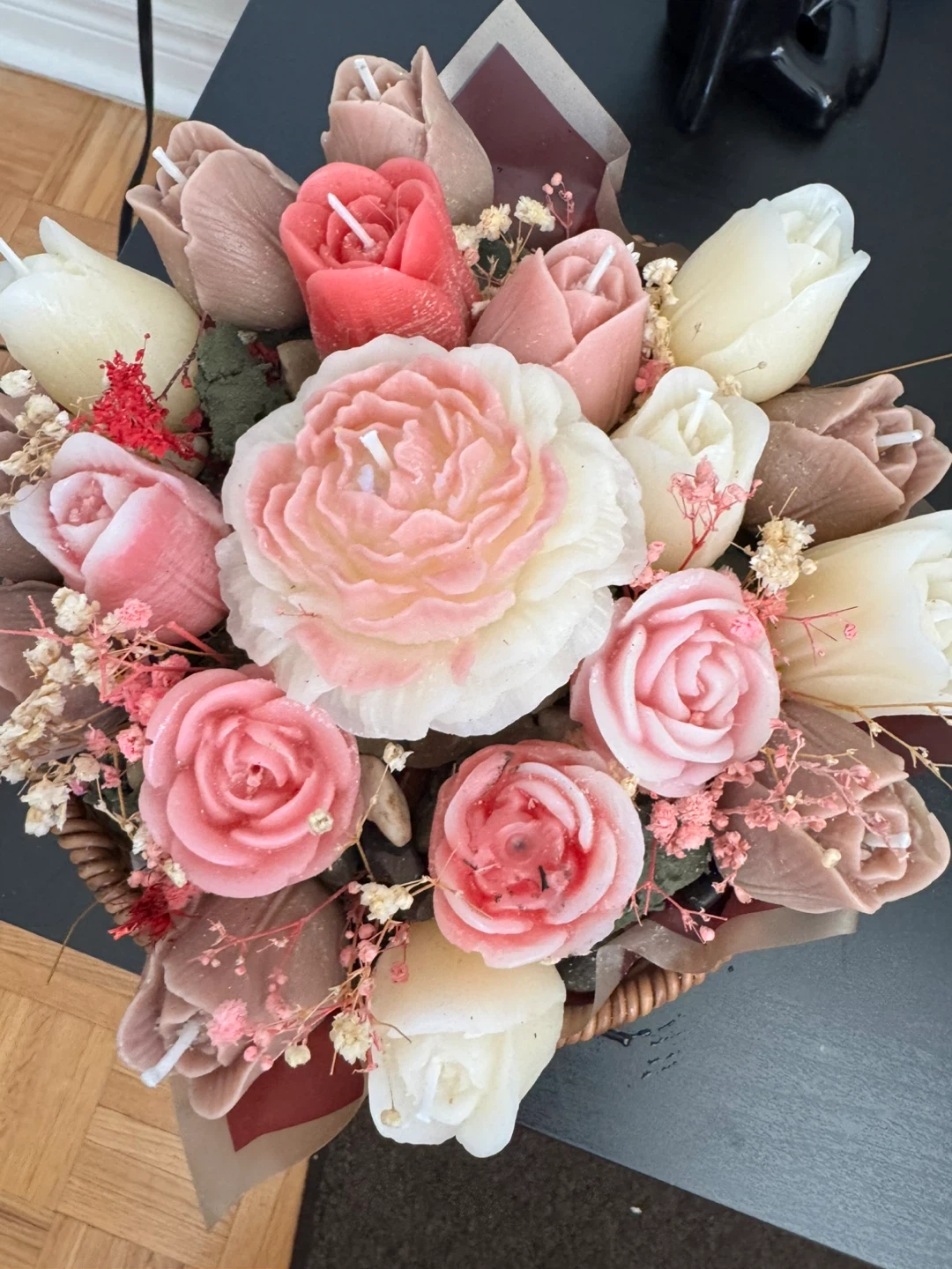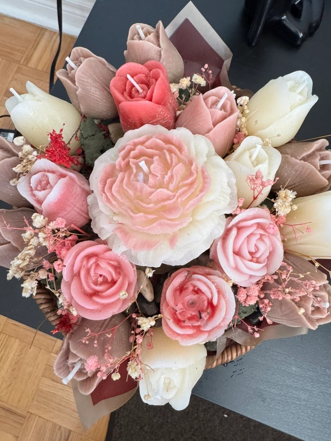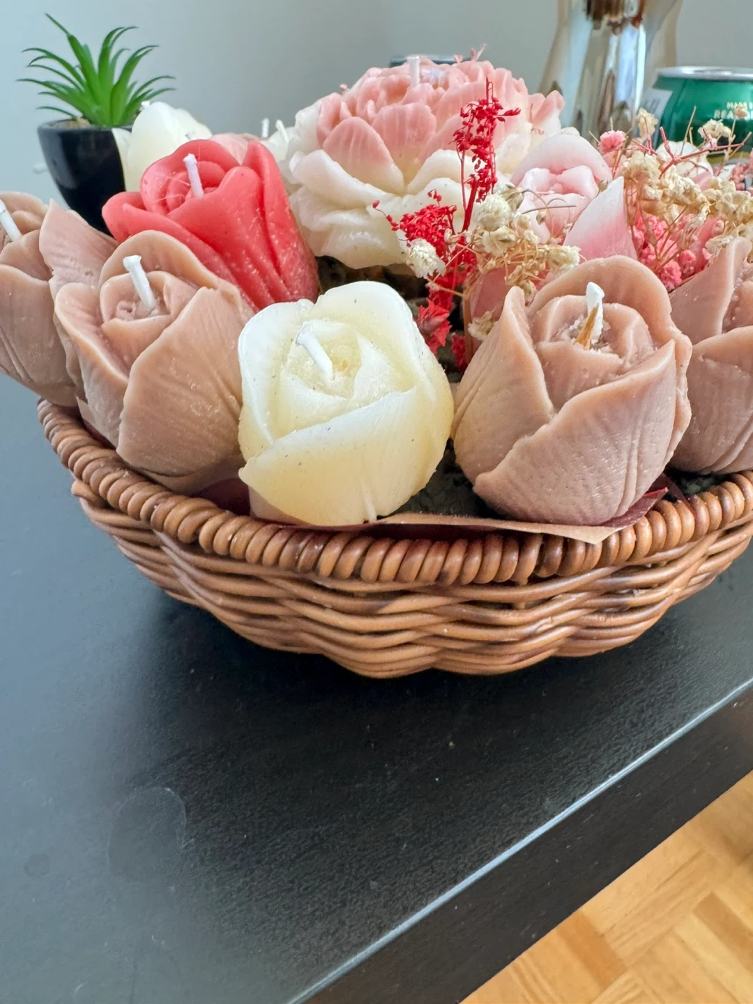 A decorative basket filled with beautiful rose and tulip-shaped candles. This arrangement features a variety of colours including pink, cream, and light brown. It's perfect for adding a charming touch to your home decor or as a thoughtful gift!