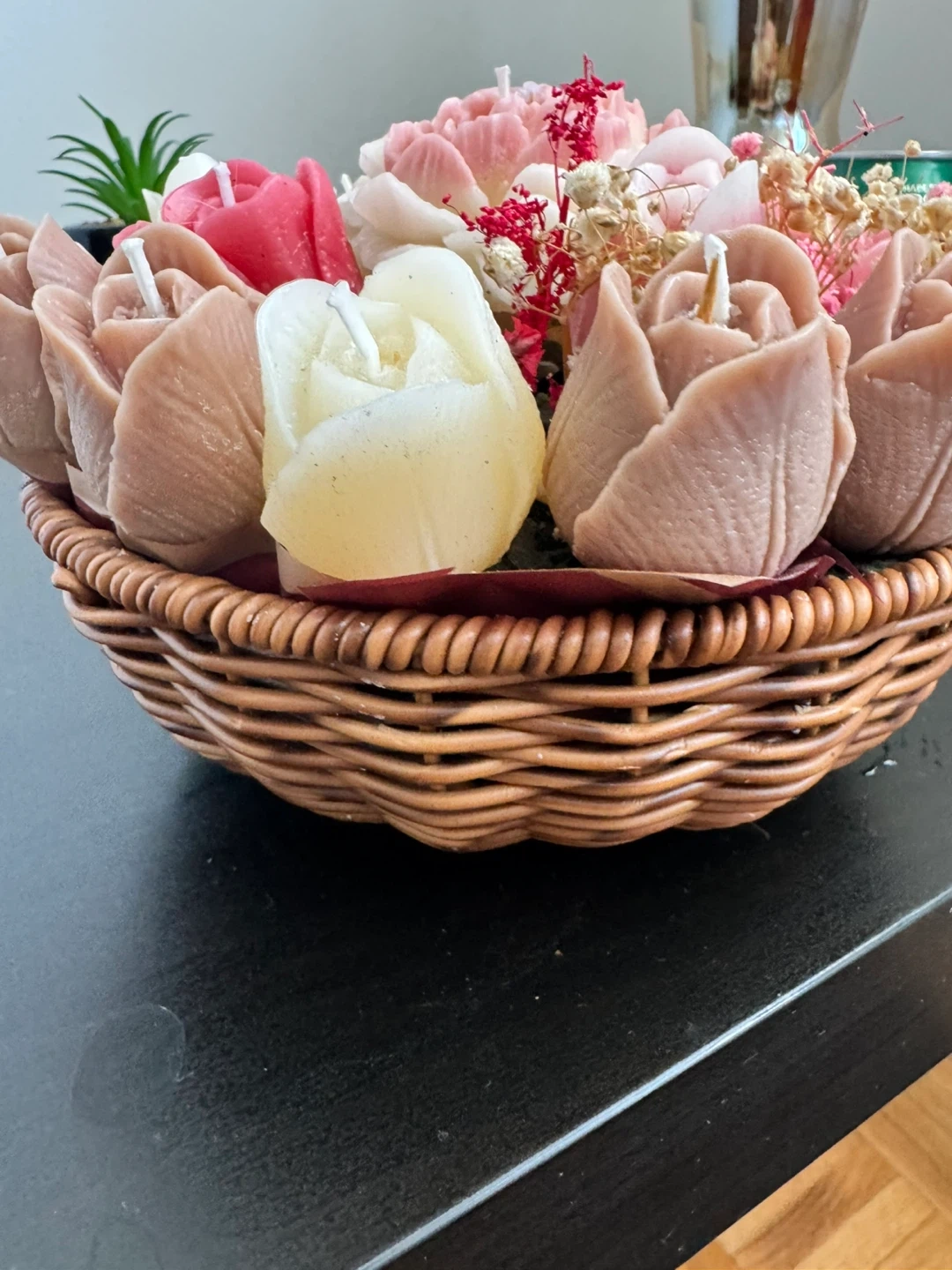 A decorative basket filled with beautiful rose and tulip-shaped candles. This arrangement features a variety of colours including pink, cream, and light brown. It's perfect for adding a charming touch to your home decor or as a thoughtful gift!