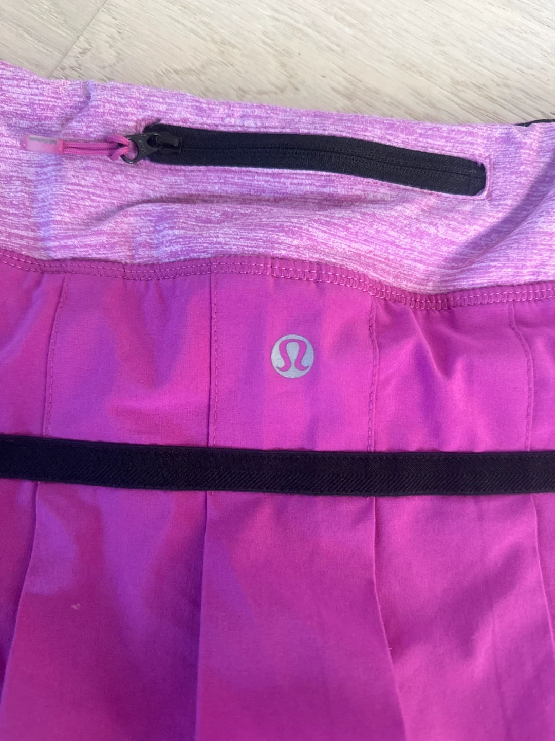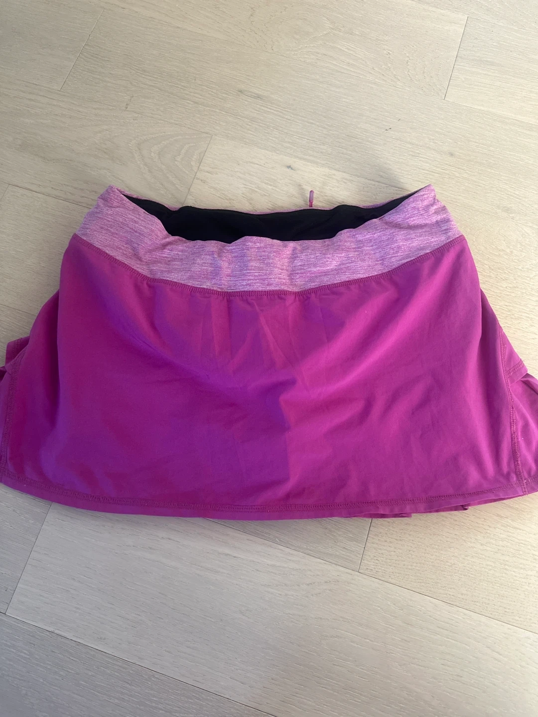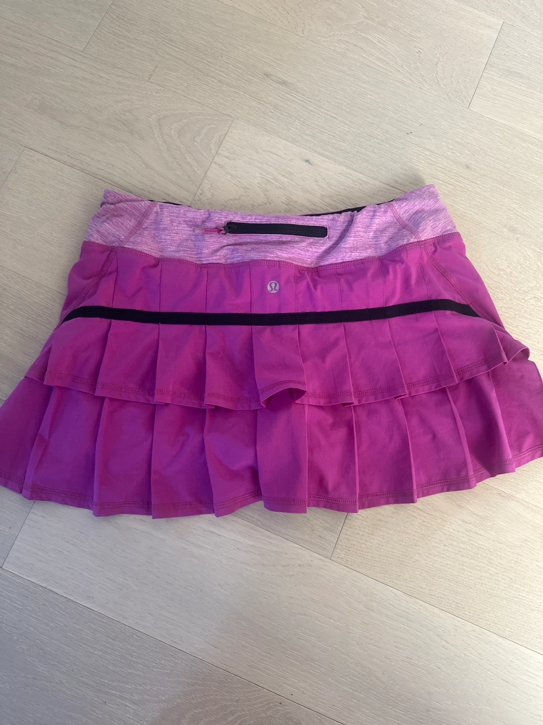 This Lululemon tennis skirt is a vibrant magenta and purple. It features a pleated design, a black accent stripe, and a zippered pocket on the waistband. Built-in shorts are included for comfort and coverage. It's perfect for sports like tennis or running! Size 4