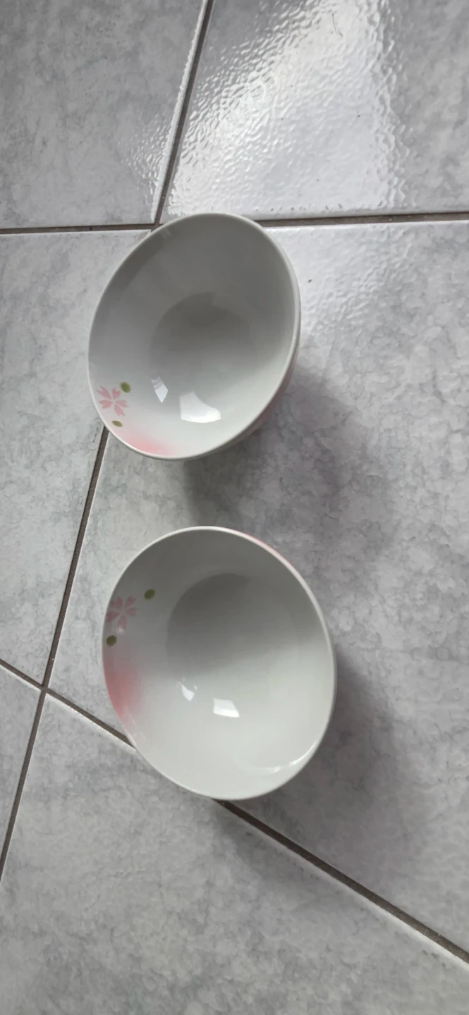 This is a set of two ceramic bowls featuring a lovely pink cherry blossom design. Each bowl is white with pink accents and delicate floral patterns.