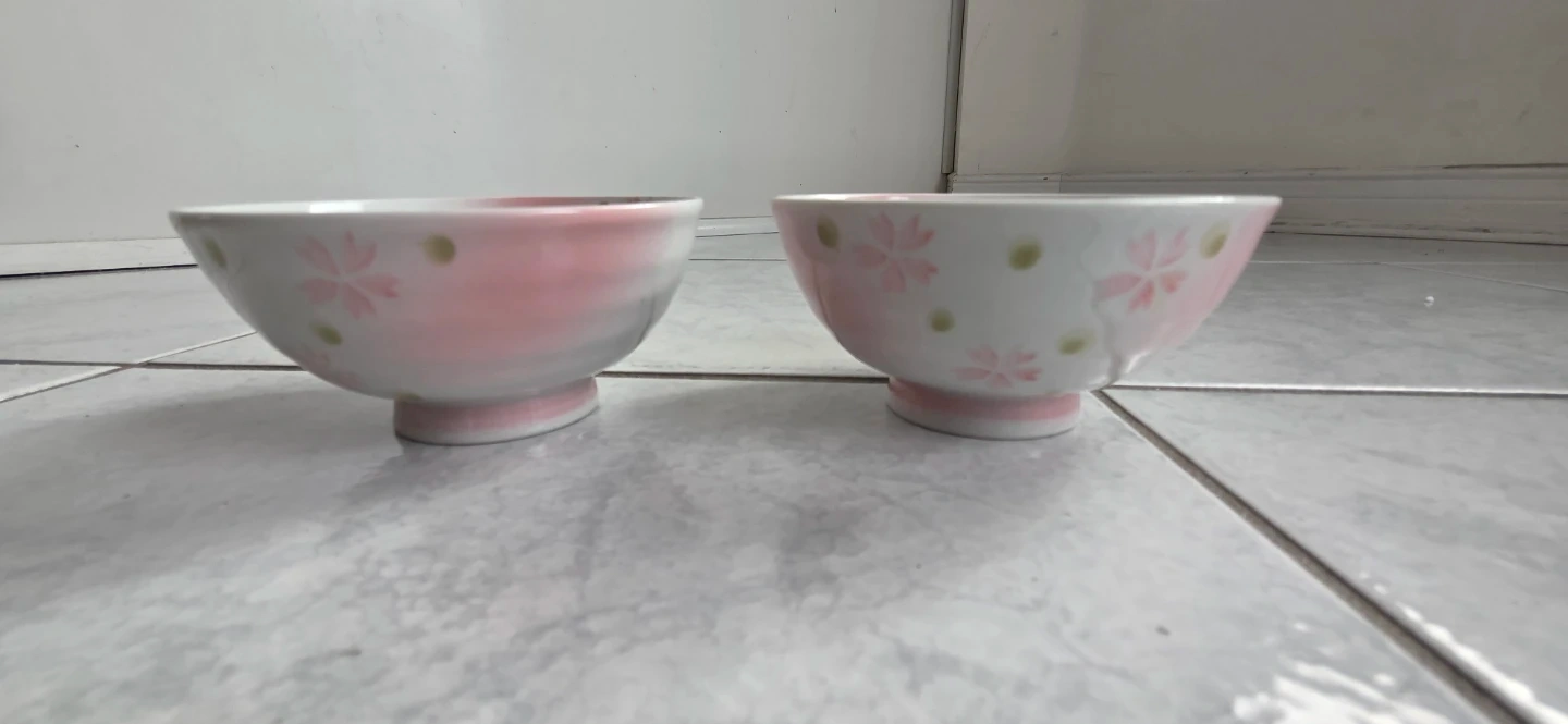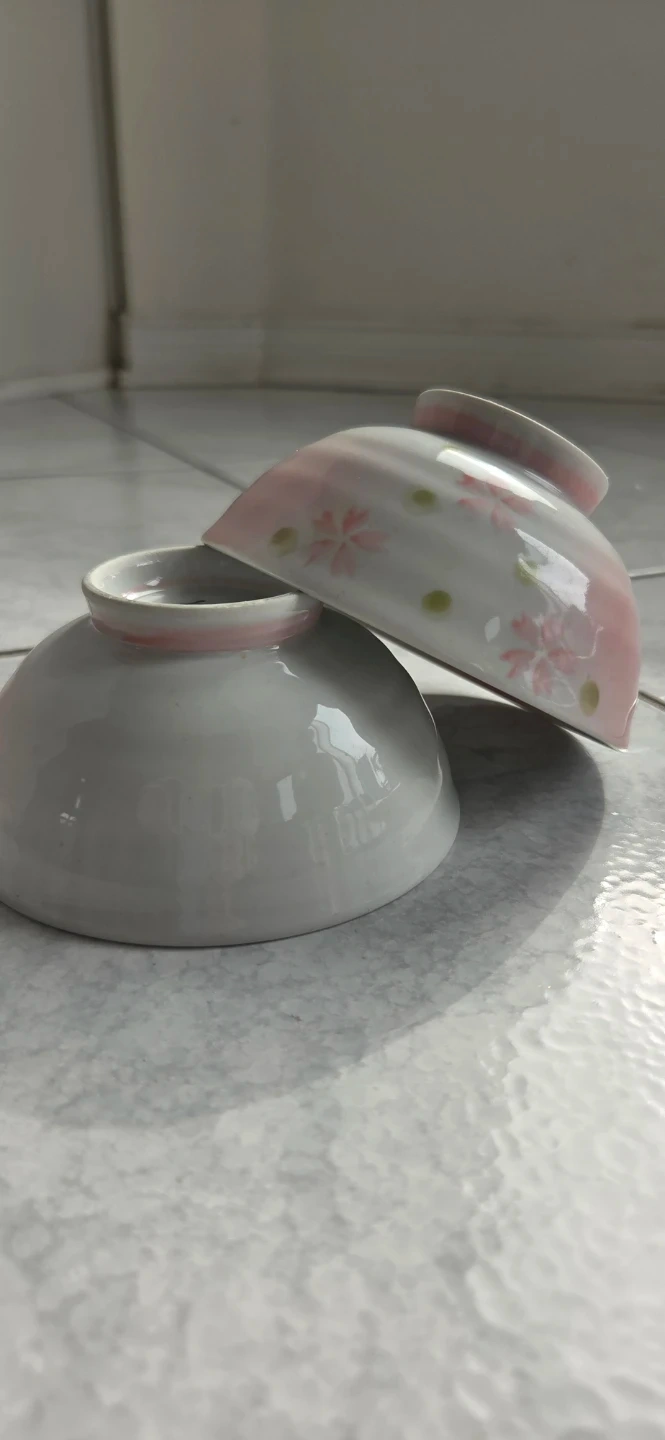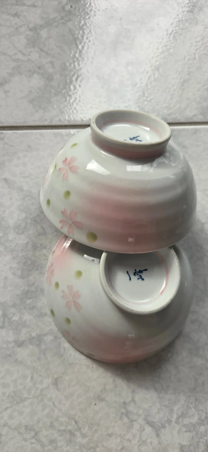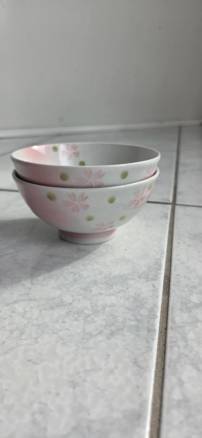 This is a set of two ceramic bowls featuring a lovely pink cherry blossom design. Each bowl is white with pink accents and delicate floral patterns.