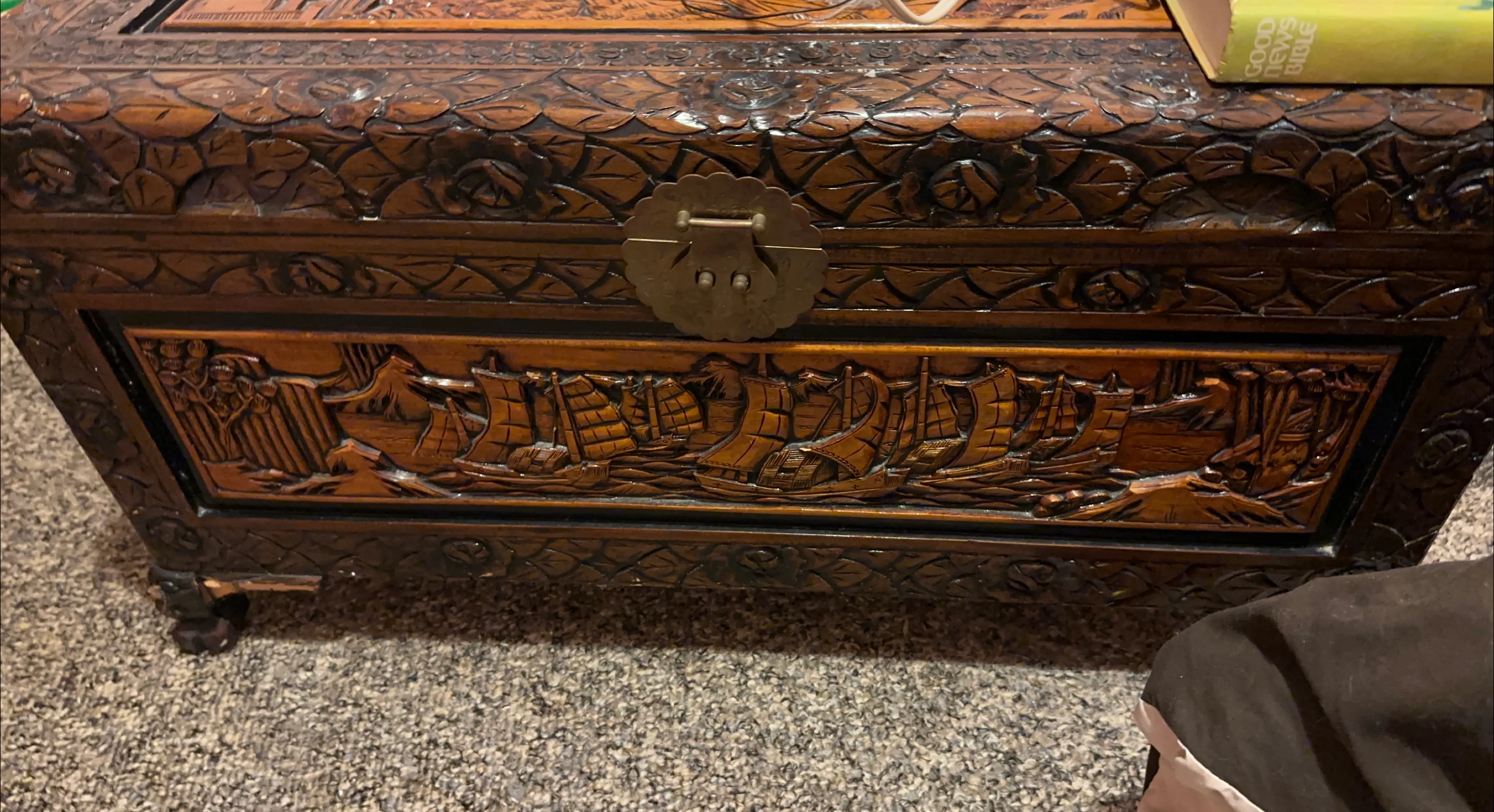 Check out this beautiful vintage carved wood chest! It features detailed carvings of ships and foliage. It would make a lovely addition to any home as a decorative piece or for storage