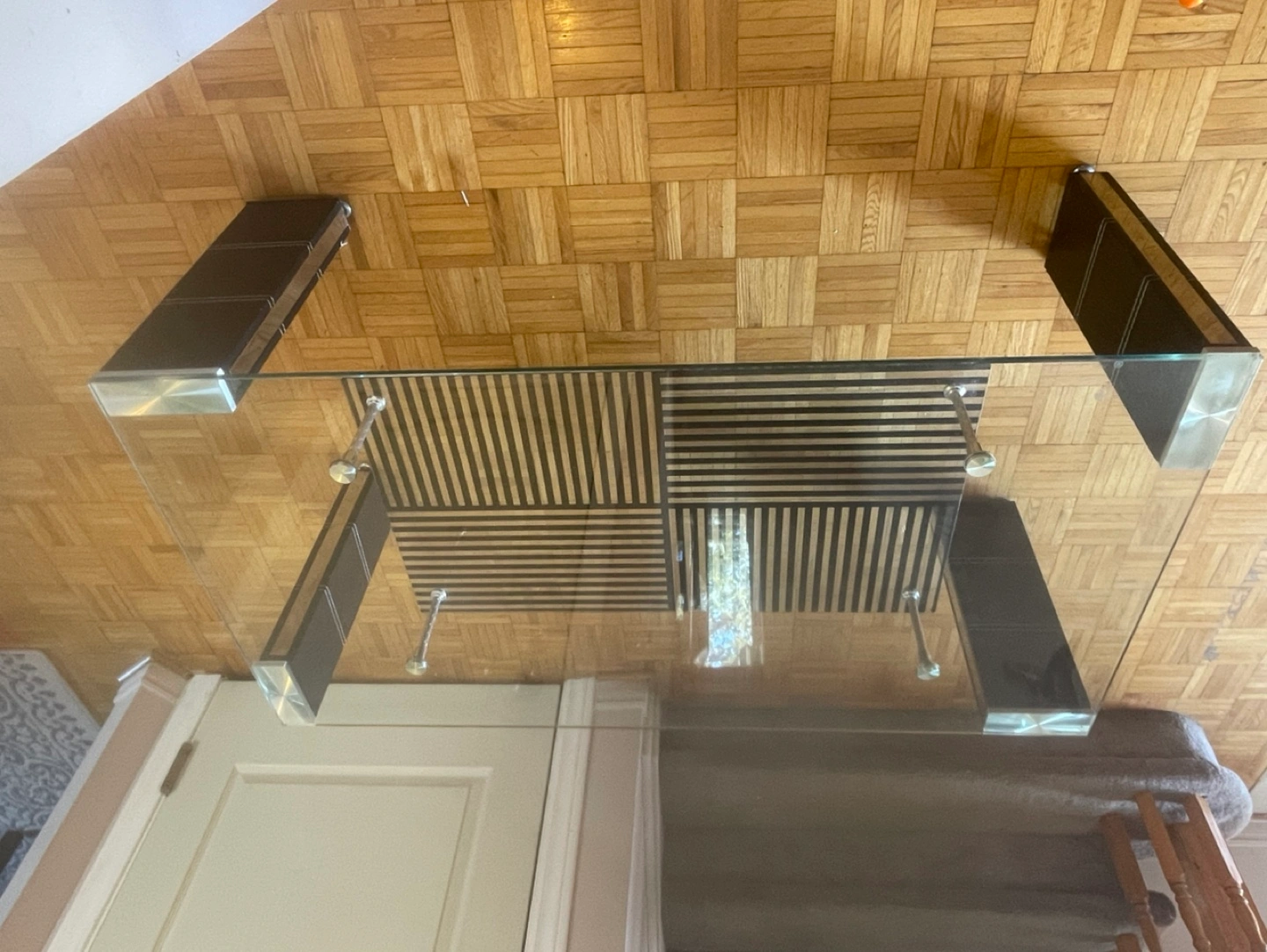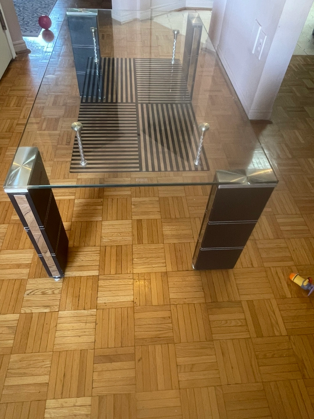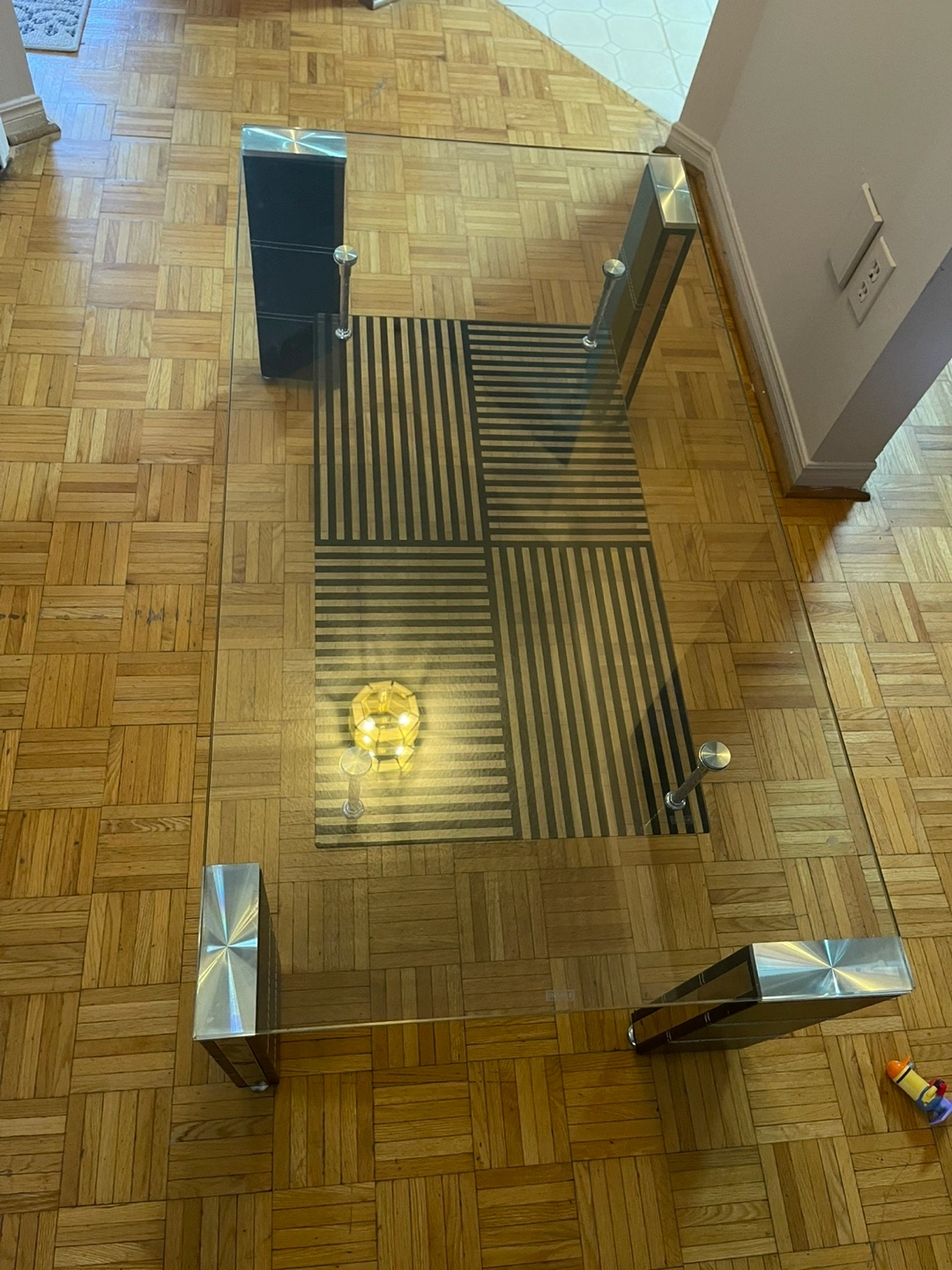 Contemporary coffee table. Features a clear glass top and sleek black legs. Unique geometric design detail underneath the glass. Excellent for modern living rooms.