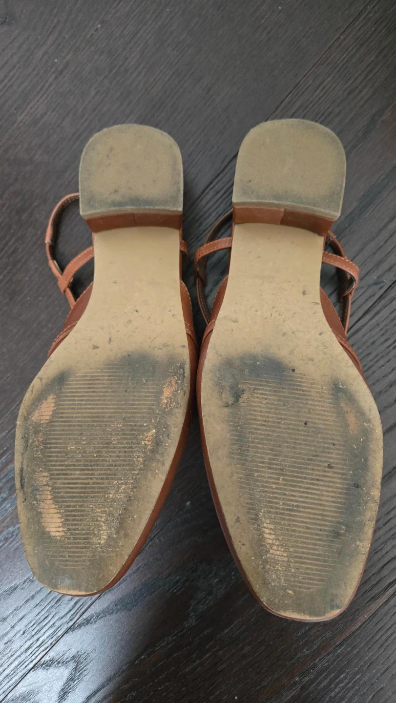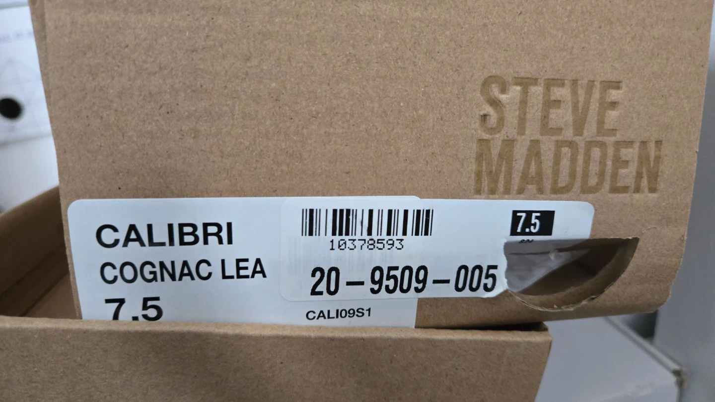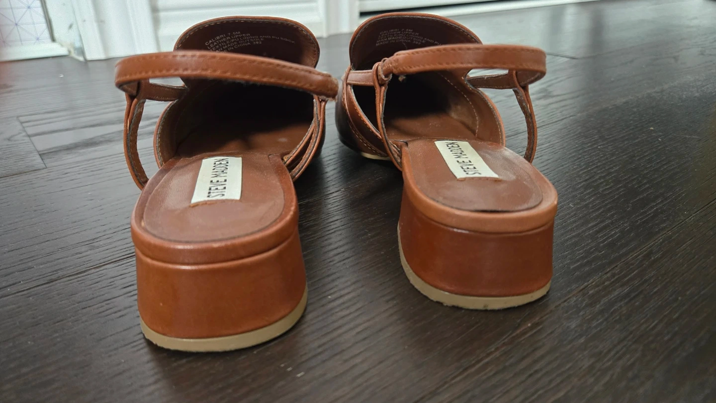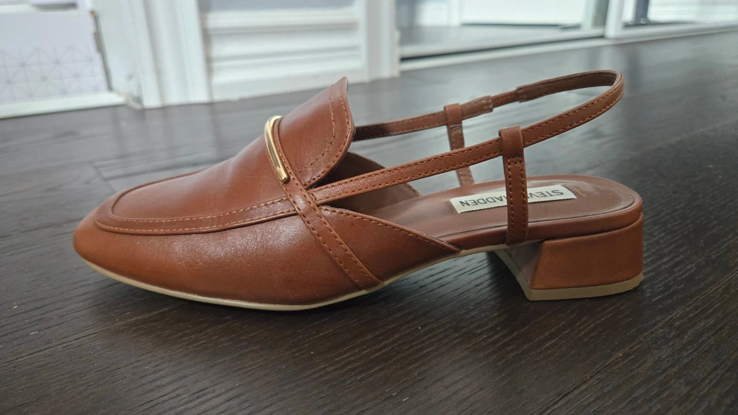 Brown leather slingback loafer-style shoes from Steve Madden. Features a gold-tone accent across the vamp and a low block heel. These shoes are a size 7.5.