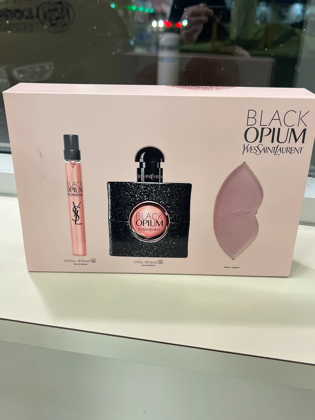 This Yves Saint Laurent Black Opium gift set includes a 50ml Eau de Parfum, a 10 ml travel spray, and a lip-shaped mirror. It's a perfect scent for evening wear. Made in France.