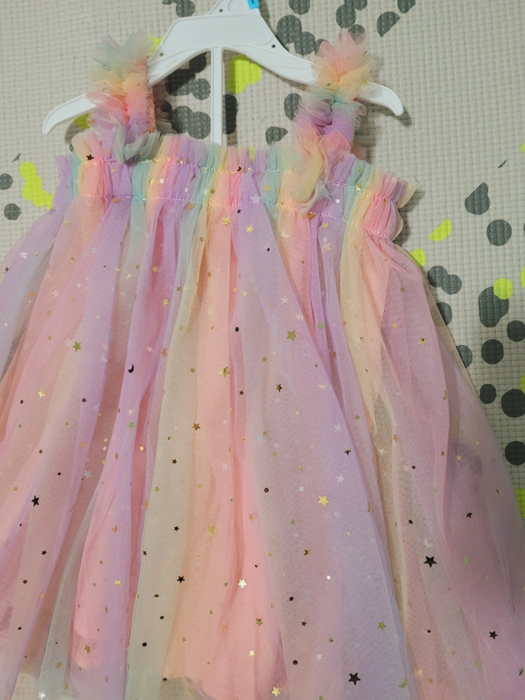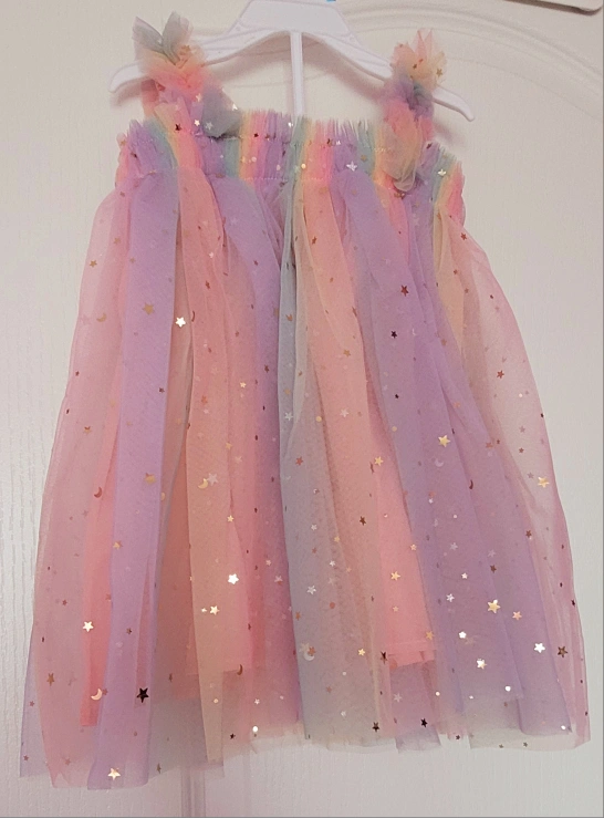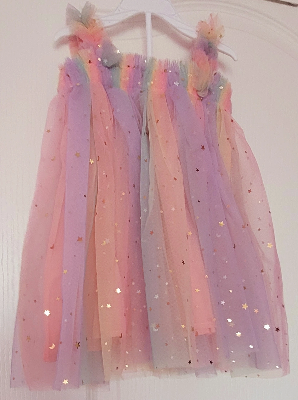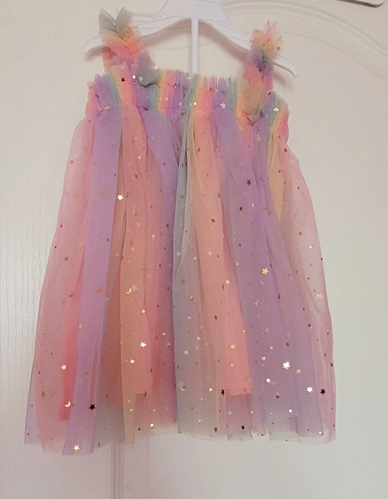 Rainbow tulle dress with gold star print. Sleeveless with ruffled straps. Size 12 to 18 months. comes from smoke and pet free home