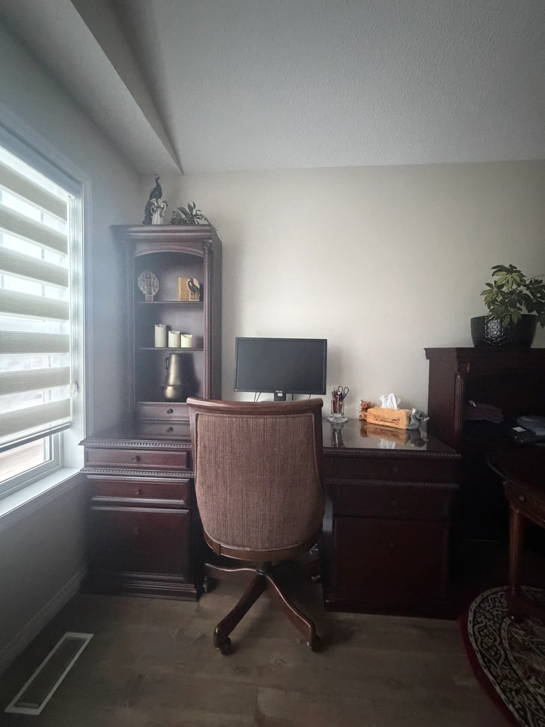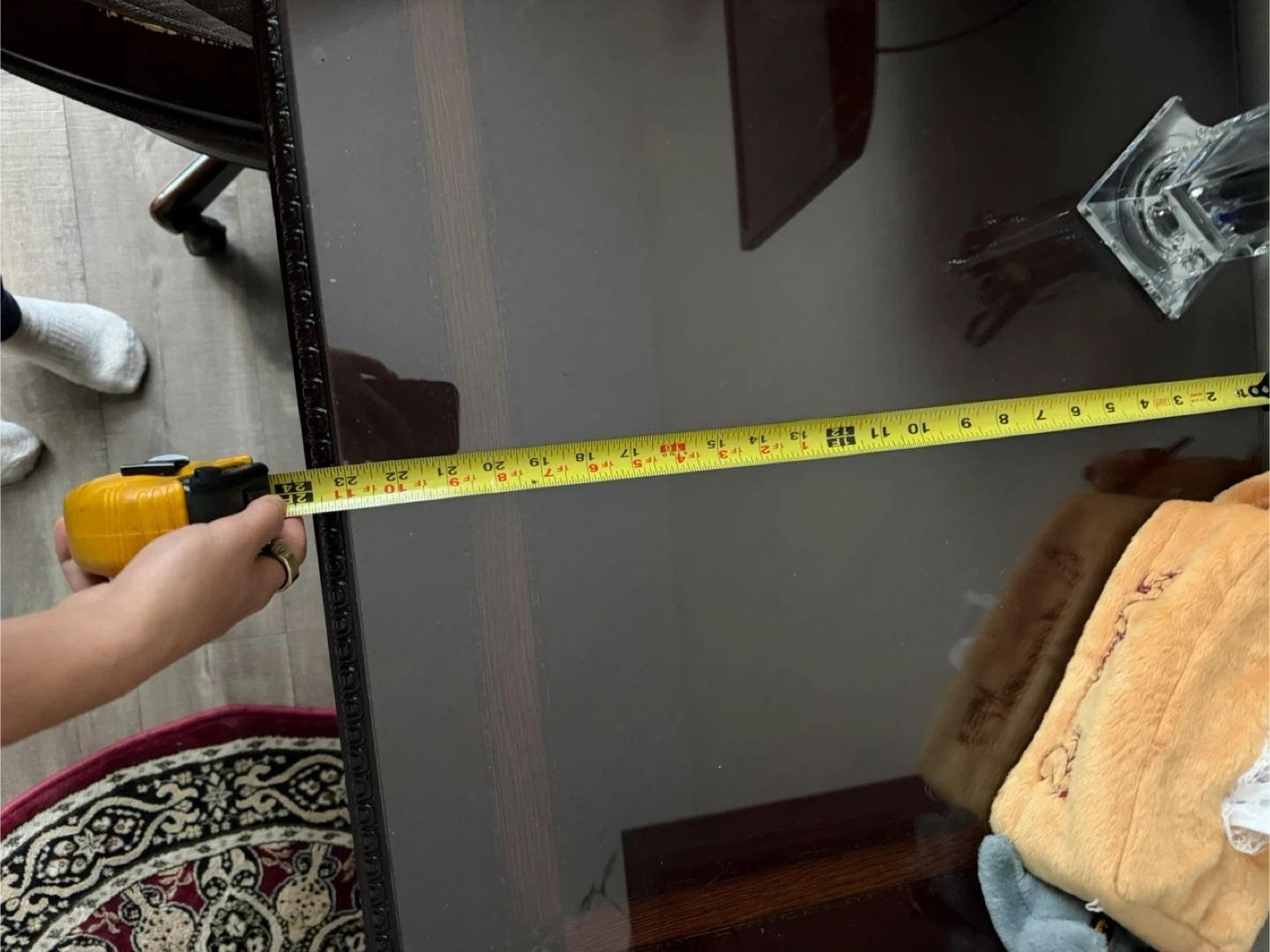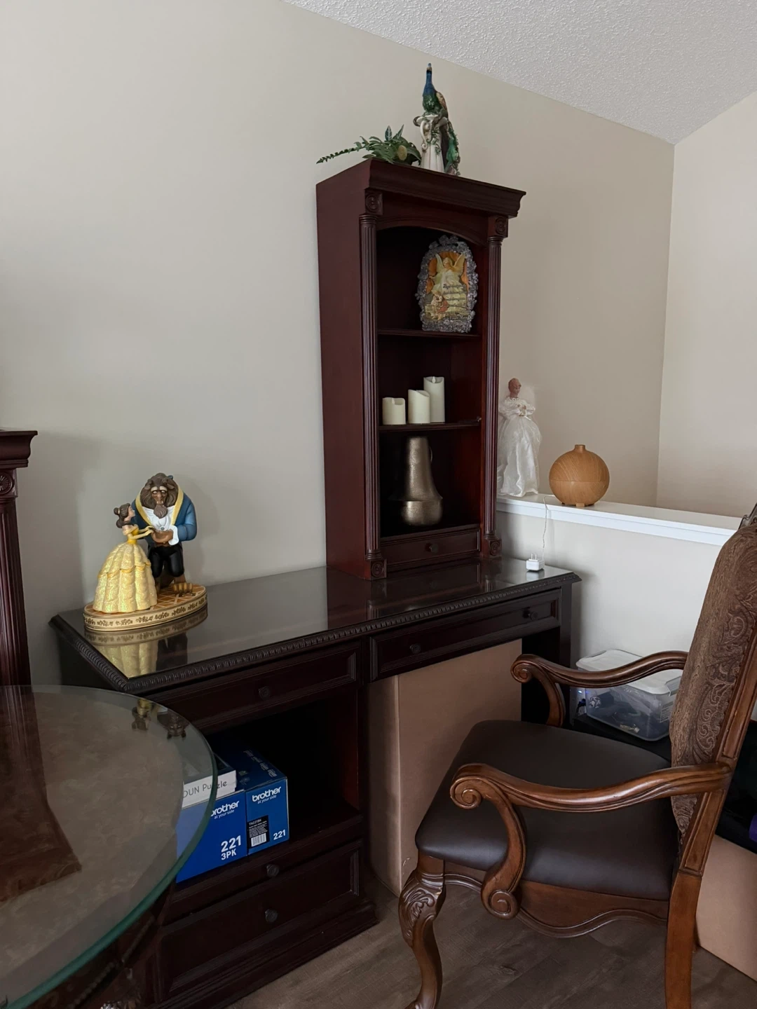 The desks are Bombay high-quality wood with a special sized glass for the top. They are 2ft wide and one desk is 10ft long and the other desk is 6 ft.