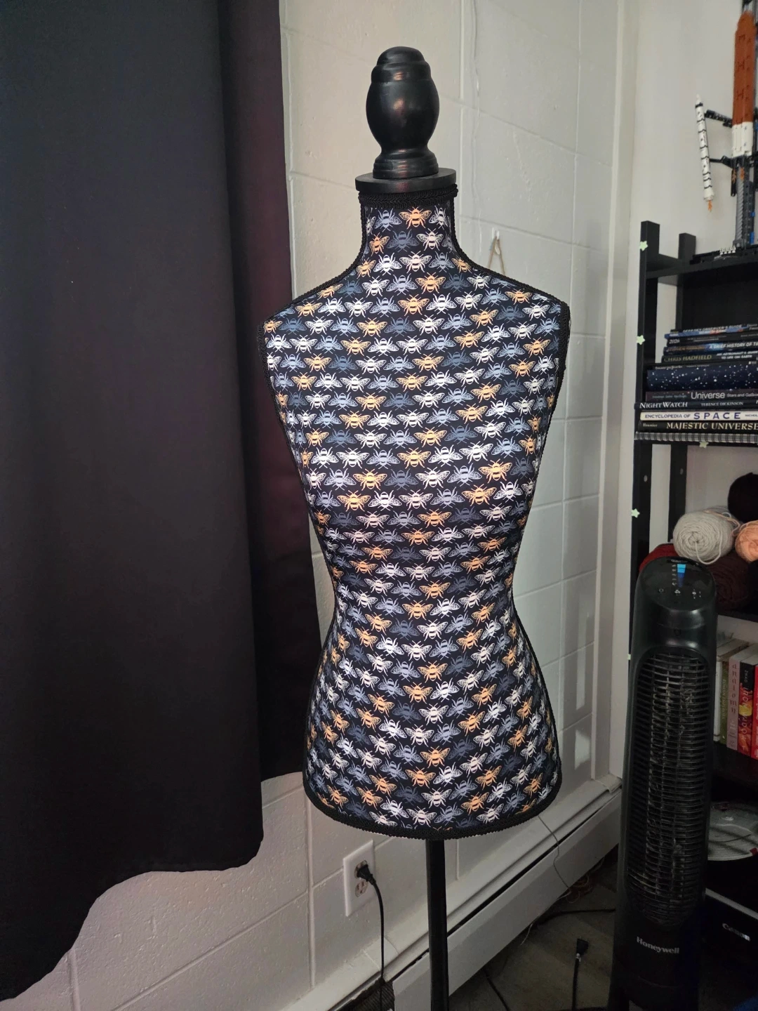 Women's dress form / upper bust model for sale. Bumblebee fabric. About 5 feet tall, excellent used condition.