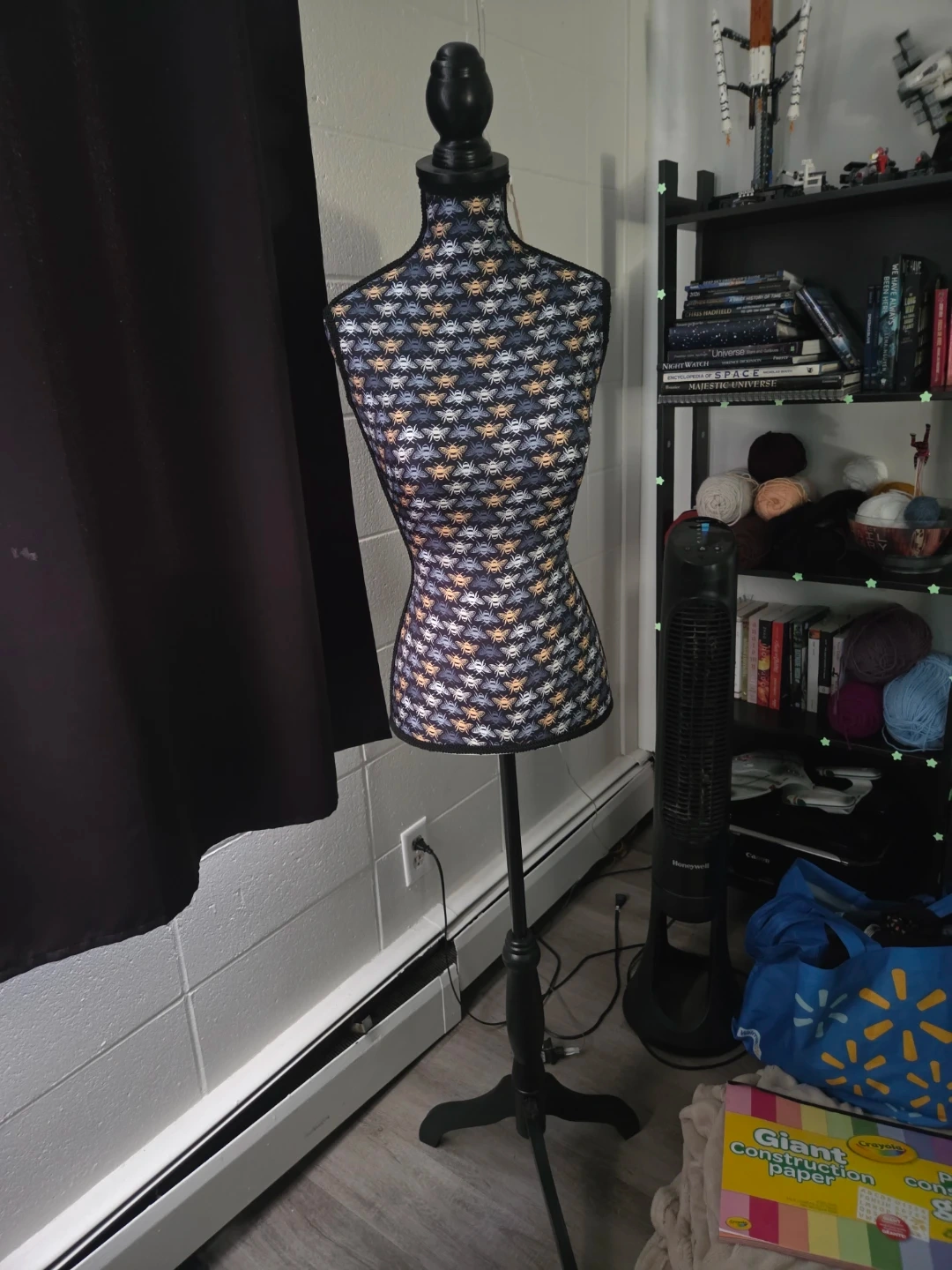 Women's dress form / upper bust model for sale. Bumblebee fabric. About 5 feet tall, excellent used condition.