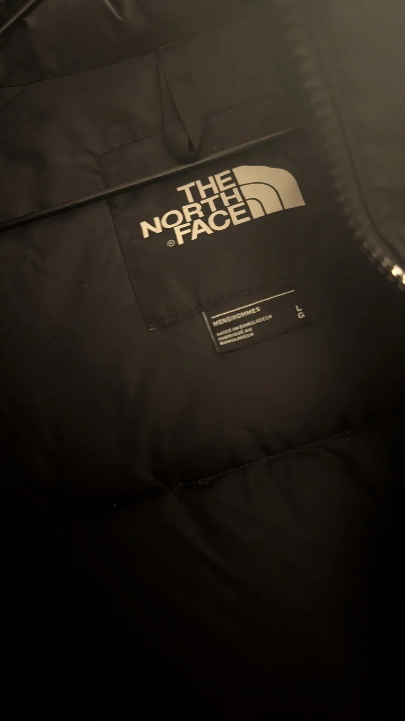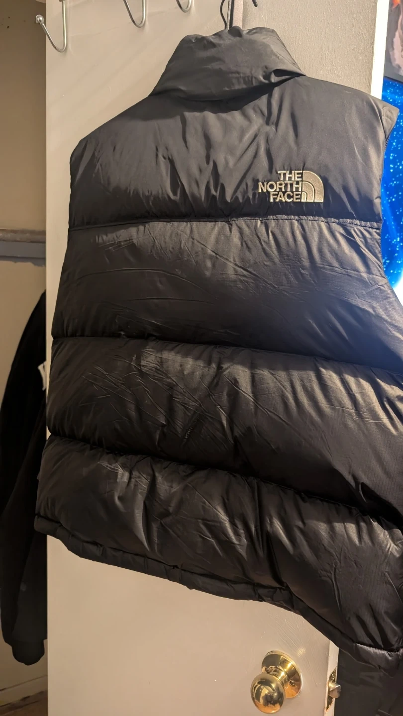 This is a used black puffer vest from The North Face. It's a men's size large. The vest is made with a durable shell and insulated fill for warmth.